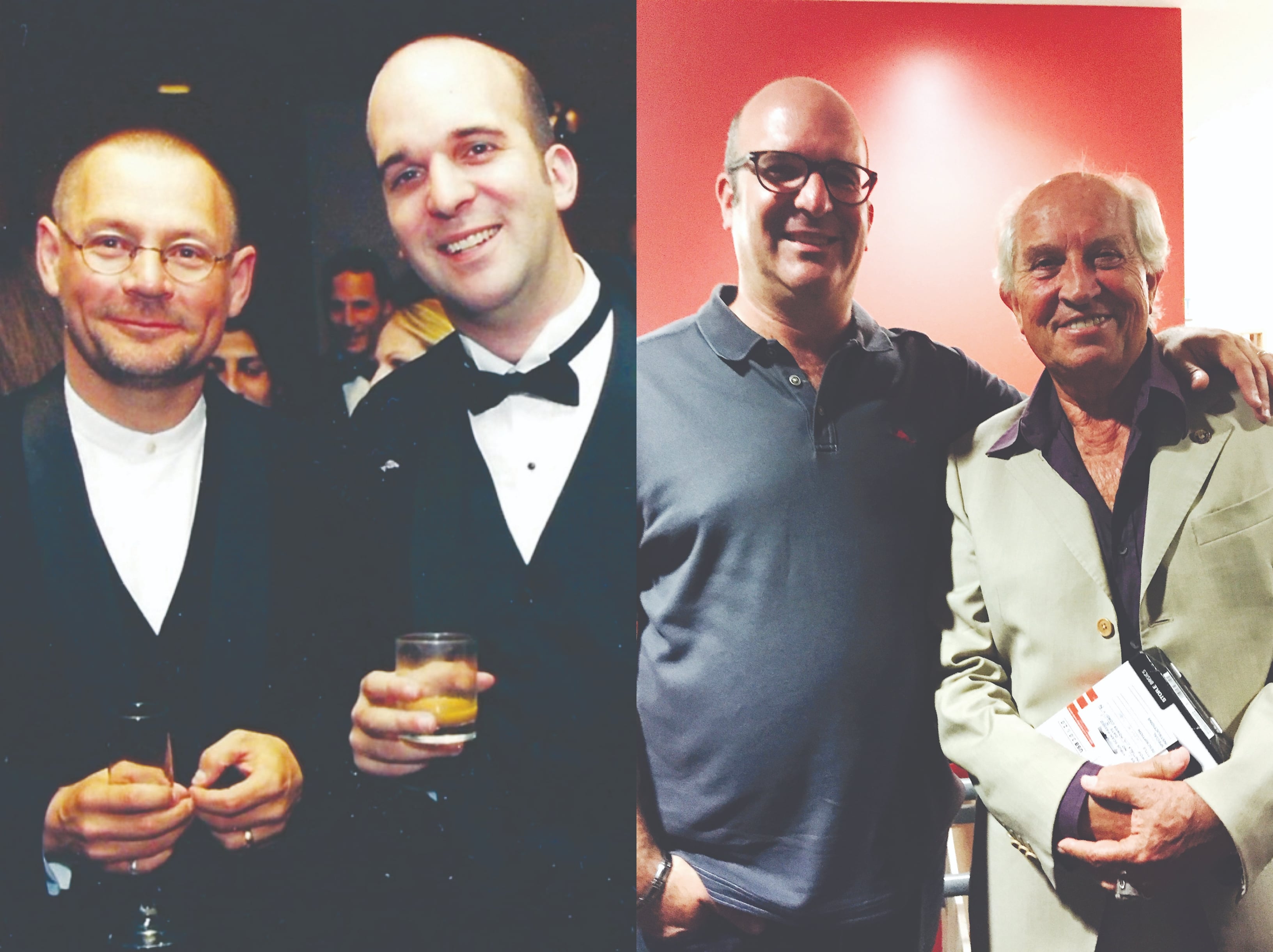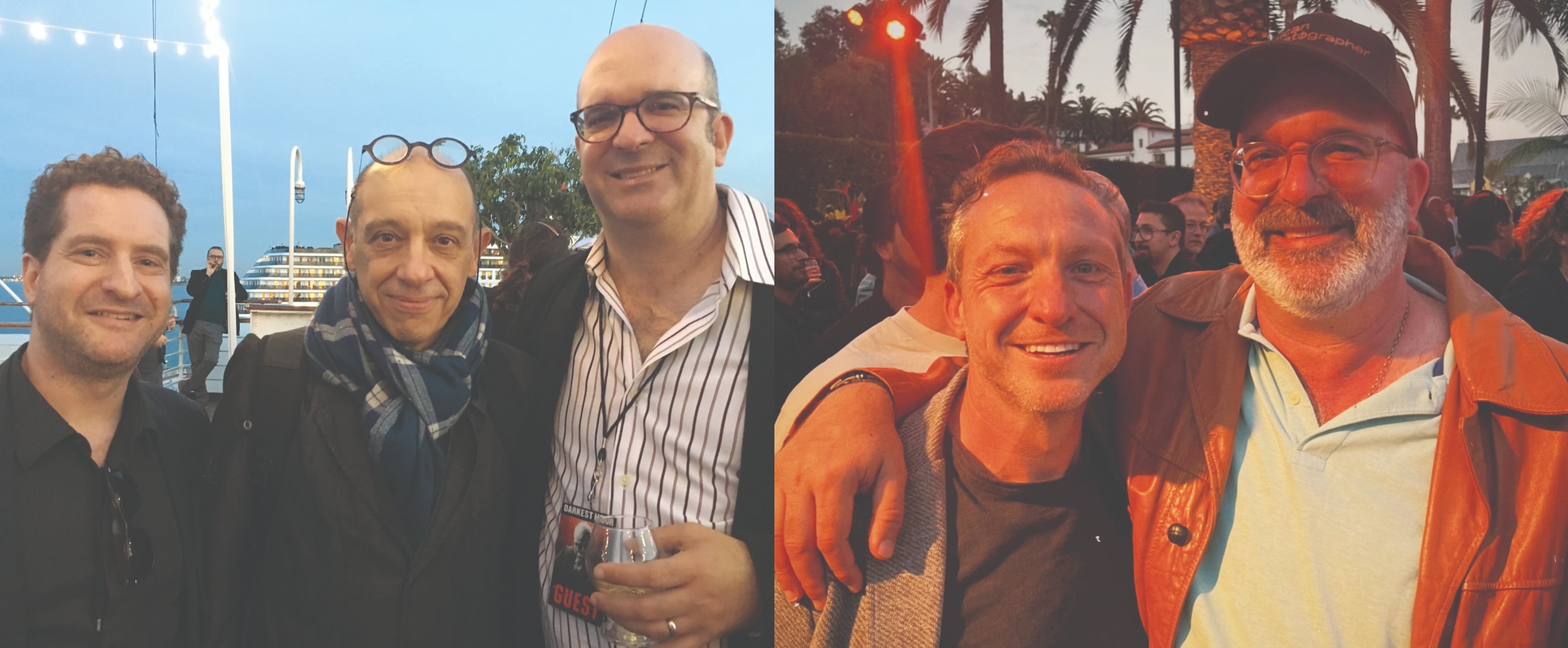 AC Associate Editor (now Managing Editor) Andrew Fish and Pizzello find Bruno Delbonnel, ASC, AFC aboard the RMS Queen Mary at a 2017 exhibition and party celebrating the feature 'Darkest Hour'; bonding with Lol Crawley, ASC, BSC during the ASC’s annual Cine Gear barbecue in 2025. (Left photo by Phil Rhodes; right photo by Anna Gudbrands.)