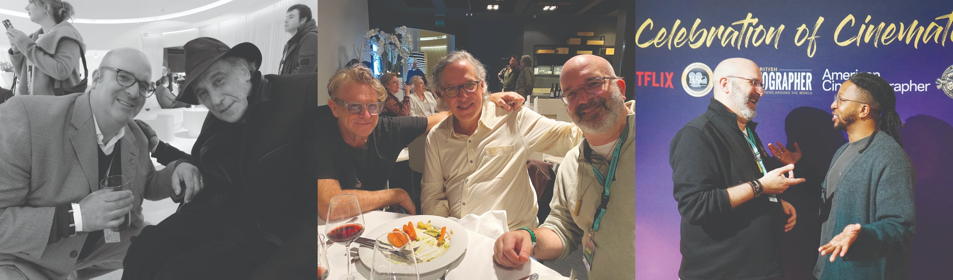Three shots from the 2024 Camerimage Festival in Poland. From left: Taking five with Ed Lachman, ASC during a party at the Hotel Bulwar in Toruń; enjoying a lively dinner with Anthony Dod Mantle, ASC, BSC, DFF and Rodrigo Prieto, ASC, AMC; sharing a laugh with Jomo Fray, ASC, one of the magazine’s 2022 Rising Stars of Cinematography, at the ASC-BSC mixer. (Middle photo by Anna Gudbrands; right photo by Lars Pettersson, FSF.)