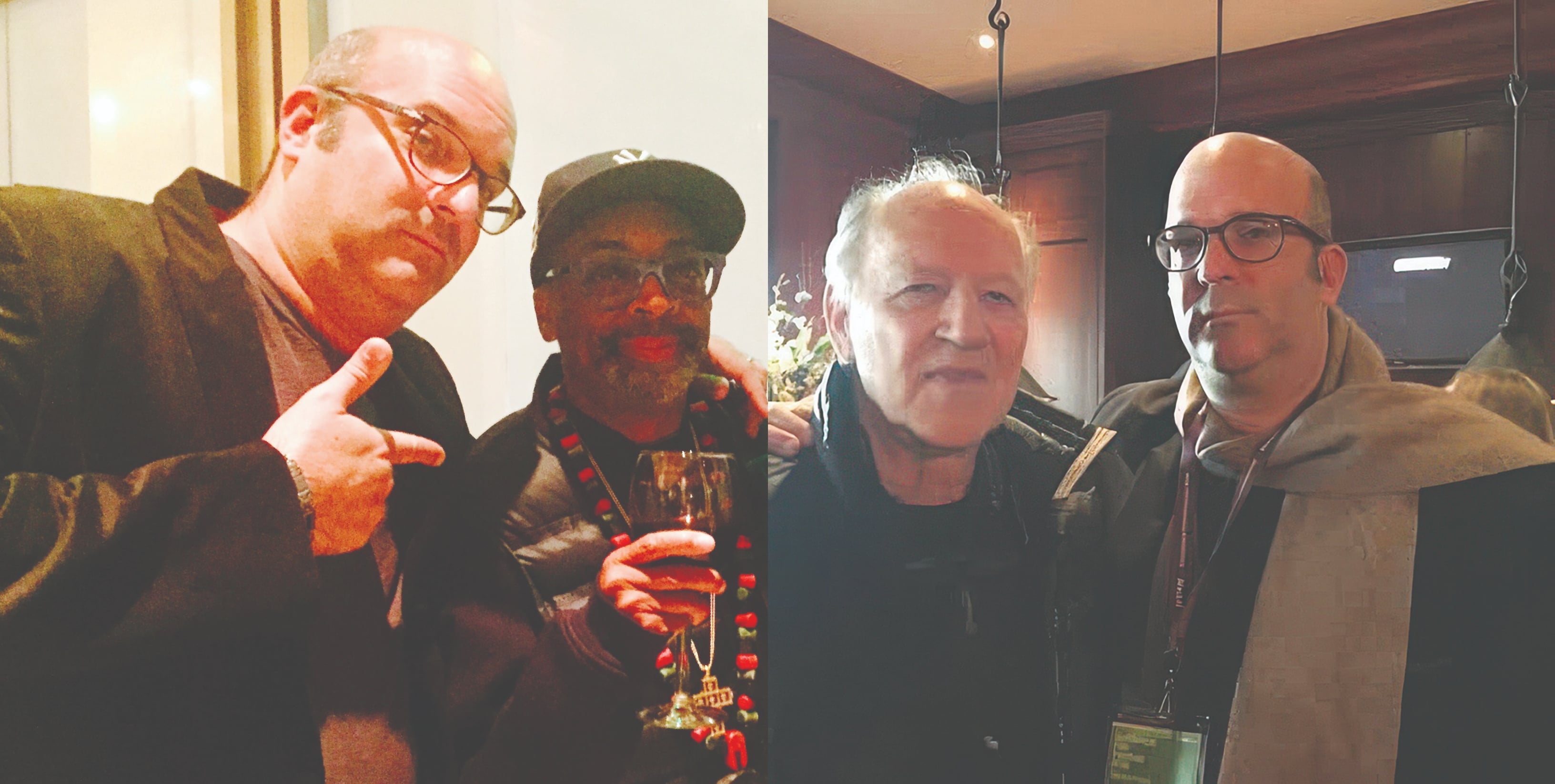The lifelong Boston sports fan makes (temporary) peace with New York superfan Spike Lee at a 2016 party for the director’s feature 'Chi-Raq'; maintaining Werner Herzog’s “No smiles!” directive at the 2016 Sundance Film Festival. (Left photo by Delphine Figueras; right photo by Andrew Fish.)