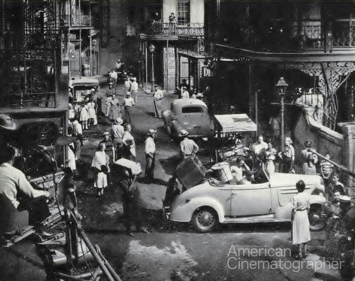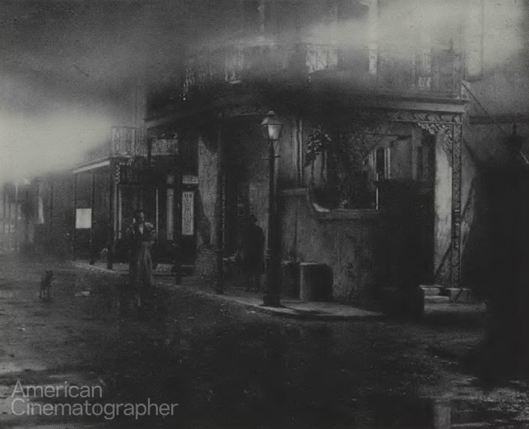 The effect of this locale on the screen is a perfect combination of settings by five-time Academy Award winner Richard Day, and the photography of Stradling. The exterior street scene, constructed inside Stage One of the Warner Brothers’ lot, is lighted for low-key night effect to provide a mood of sordidness softened by the romance of fantasy as visualized through the dream-shrouded eves of the main character. Added to the effect of the lighting is a fine mist, so subtle and yet so compelling that one can actually feel the oppressive humidity of New Orleans.