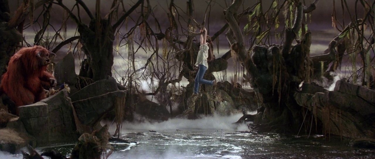The film's numerous stage-bound settings created their own unique problems. One of the trickiest of these locations was a large swamp filled with bubbling paint, known as the Bog of Stench. "It's the Bog of Eternal Stench," Henson corrects, "and if you step in this thing, you smell bad for the rest of your life! It also makes terrible, bathroom-y noises, and try to imagine the worst possible smells! George Gibbs of special effects designed our Bog for us, because it had to have special effects taking place in it. For a scene where Ludo calls the rocks and great boulders come to the surface of the water so they're able to walk across the bog, we had to be able to get the big rocks all the way down in there, which meant the bog had to be five or six feet deep. The Bog had paint in it which would periodically get splattered on our shirts, and it wouldn't come out. We had a character named Didymous, who rides a trained dog across the rocks - a complicated thing - because if the dog slipped in, and the stuff was slightly slippery, we would have had a sort of green-brown uncleanable dog! So he had to be on a safety wire, and so did Ludo. We actually built a set of pants for the dog, so he wore little booties and fur pant legs, because we figured we could catch him if he did slip in, but he probably would have gone in as far as half a foot."