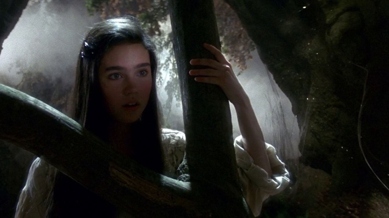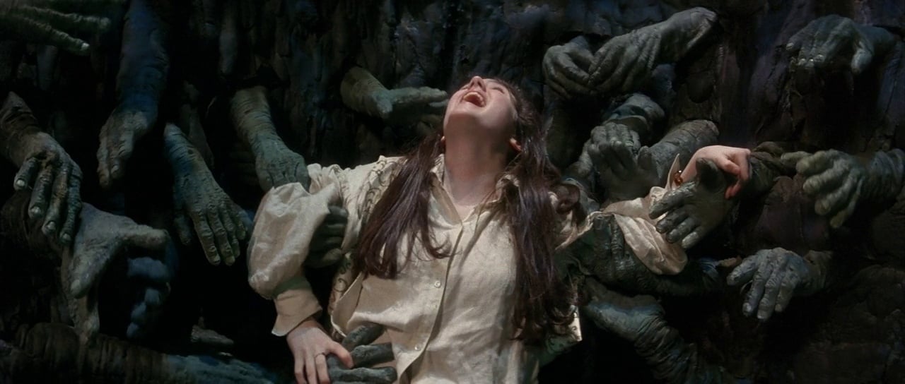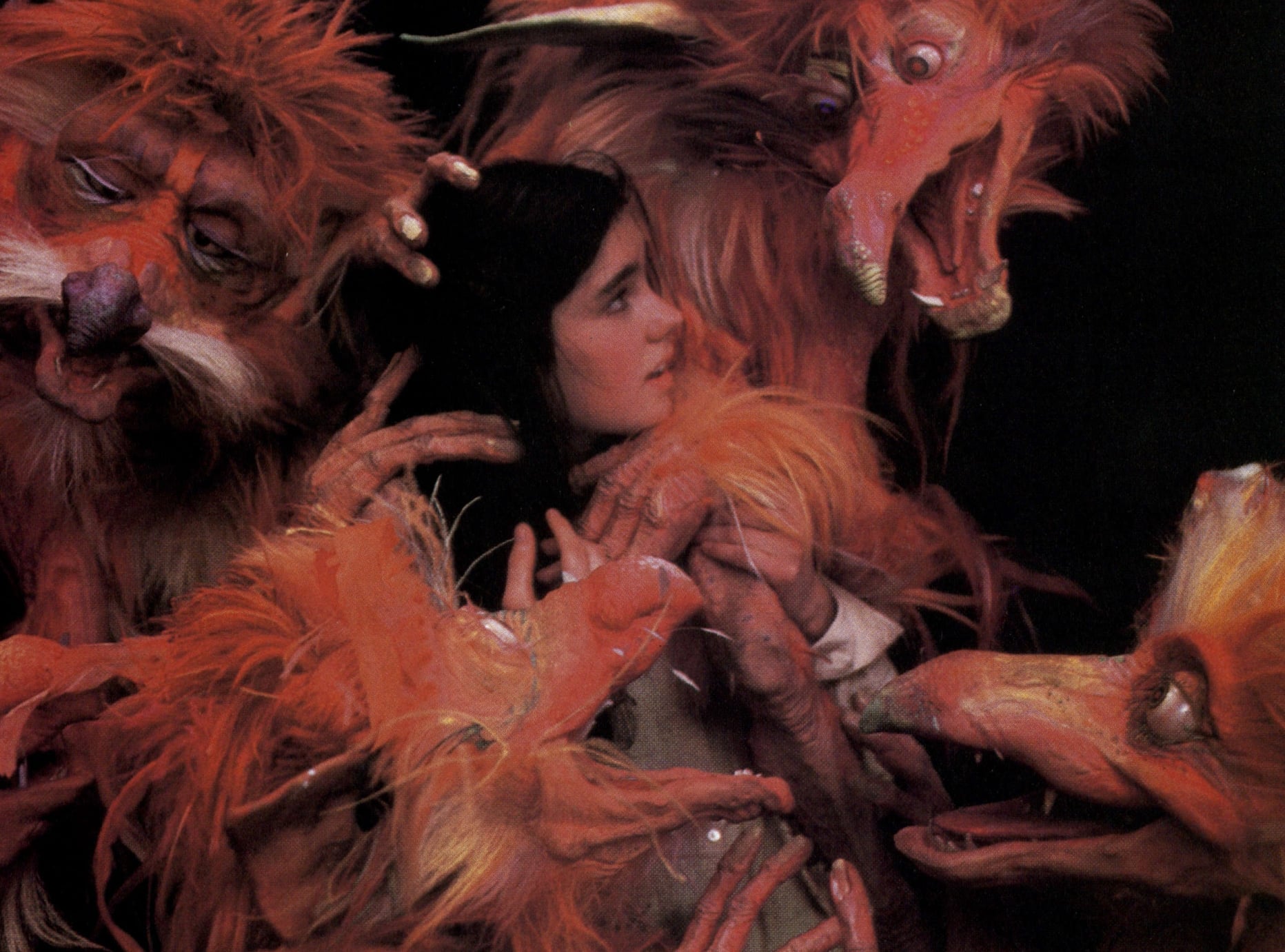 There was a large staged fall in the film as well, as actress Jennifer Connelly, who plays the adolescent protagonist, Sarah, is swallowed up by The Shaft of Hands. The set was built by George Gibbs, and the main problem seemed to be getting enough hands in there to make it look right. "We wanted to have the idea of Sarah falling through this shaft with all these hands reaching out for her,” Henson says. "We had about seventy-five extras in there, a dozen or so of our own performers, and then another several hundred more stuffed rubber hands. We got everybody in and I looked at it and I said, 'George, there seems to be a couple hundred hands missing!' and he went slightly white but he had them for me a few days later. It was an elaborate rig, because Jennifer was in a body harness on a pole arm that went out straight behind her body, and then the camera would track right down opposite her. We shot it at London's EMI studios on the Star Wars stage, which is quite tall. Jenny was up at the top of the set in this harness, quite an uncomfortable thing. There was nothing underneath her, which is scary as hell, but she was such a trooper! If anything, she slightly enjoyed heights and she never complained. When we cast the part of Sarah, I had no idea how many high-altitude shots there would be and things where she needed to do near stunts until we got into it, and what I found is that Jennifer loved all the challenges and really did it well."