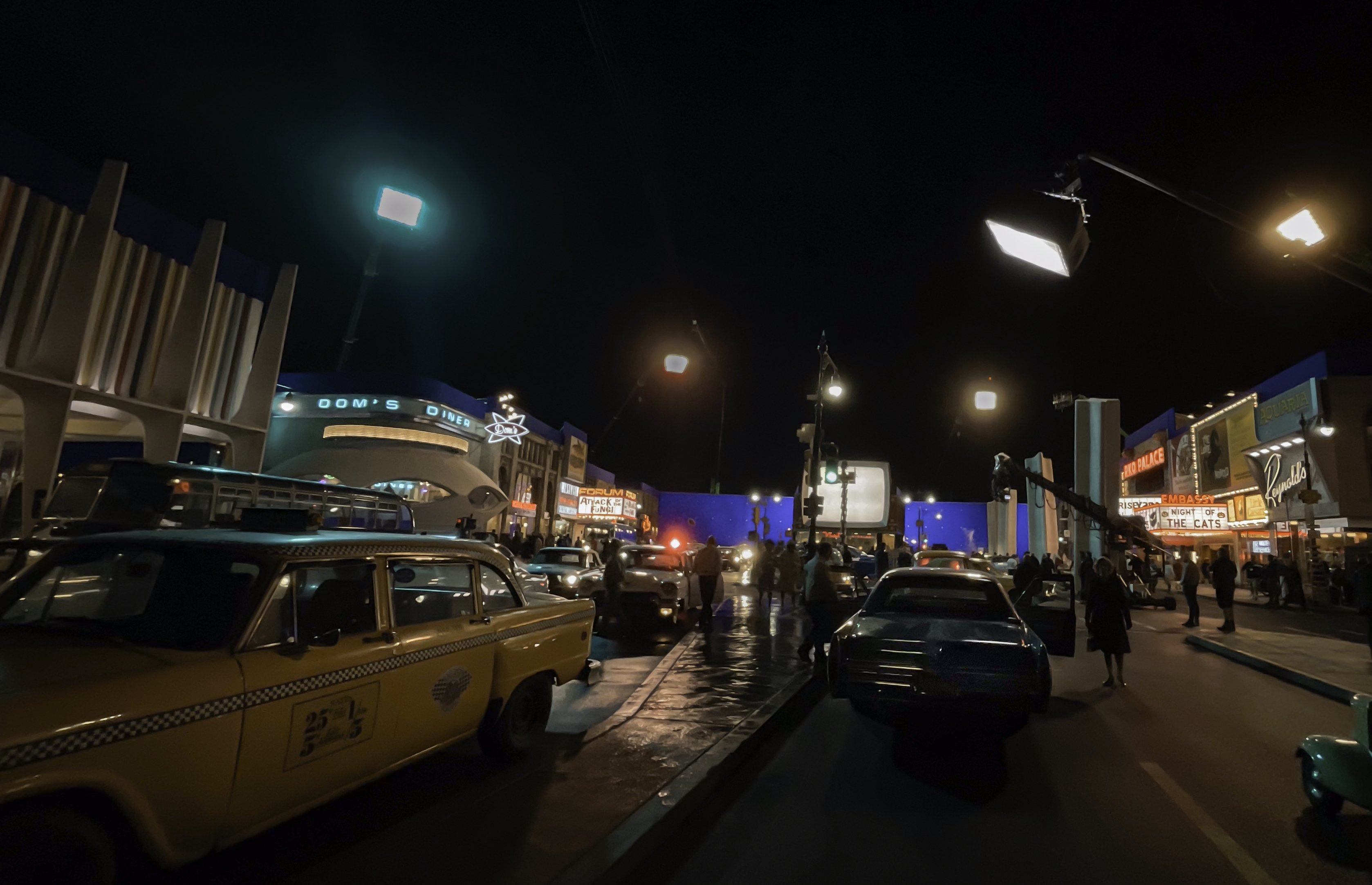 The Times Square set (pictured below) was immense — approximately only 20 percent smaller in footprint than the actual 1960s location. It featured six lanes of traffic, two theaters, more than a dozen storefronts with fully art-directed interiors, and required over 2,000 lighting fixtures.