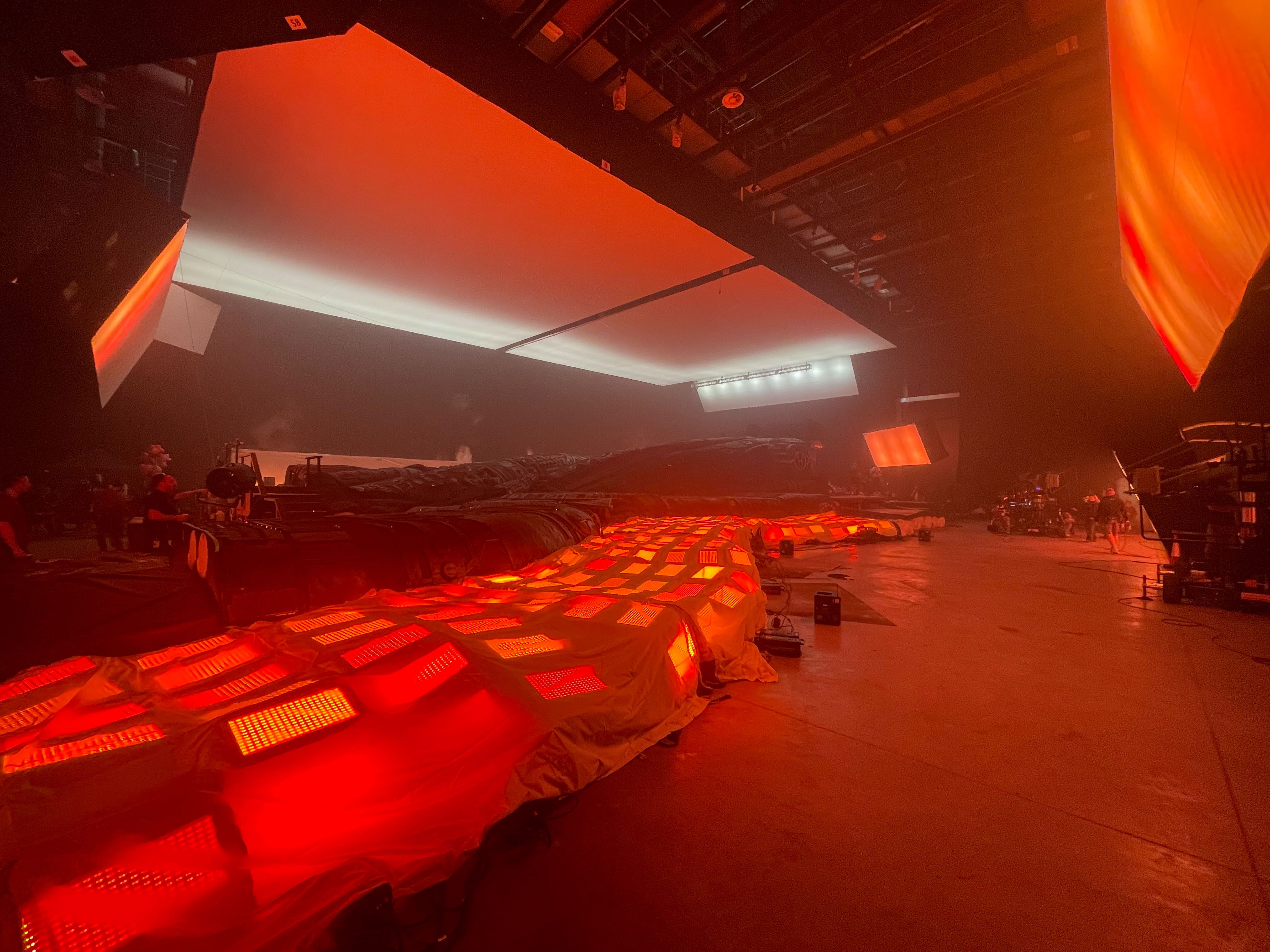 Overhead light boxes were created using a combination of Vortex8 and Prolights ECL units diffused with Magic Cloth. Multiple Litegear Auroris units were positioned on the floor to simulate flowing lava, and modulated using a complex pattern to imply movement.