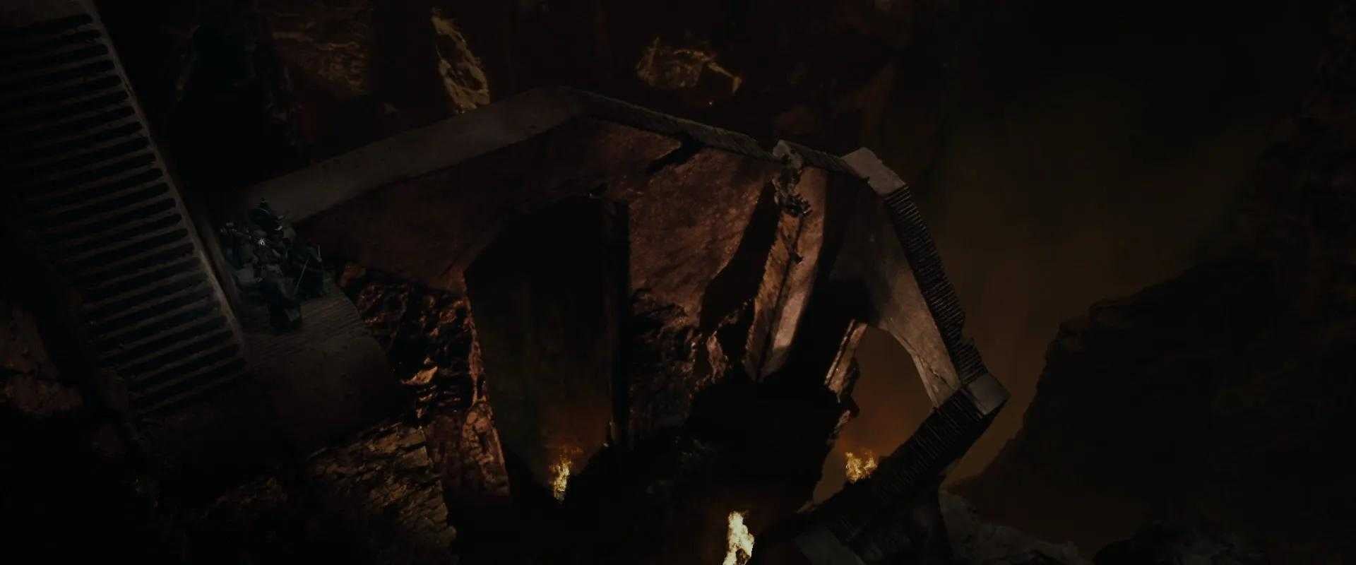 The Khazad-Dum stairway set piece, leading into a fight in the Great Hall and the mine shafts at Moria, was a massive sequence that took almost a year to shoot, and it perfectly encapsulates the problems of combining live action and miniature environments. Miniatures cinematographers Funke, Bluck, Hardberger and Schumann created epic imagery that perfectly matched the live photography by Andrew Lesnie, ACS. “They’re essentially spiraling down through the mines along very precarious walkways that the Orcs have carved over the centuries, and they’re looking up a huge shaft that stretches away into the dark,” says Funke. “It’s lit only by Gandalf’s staff, so we had the classic problem of shooting something that’s supposed to be in total darkness. The members of the Fellowship were either shot against bluescreen or, depending on how close they were, rendered as good digital doubles.”