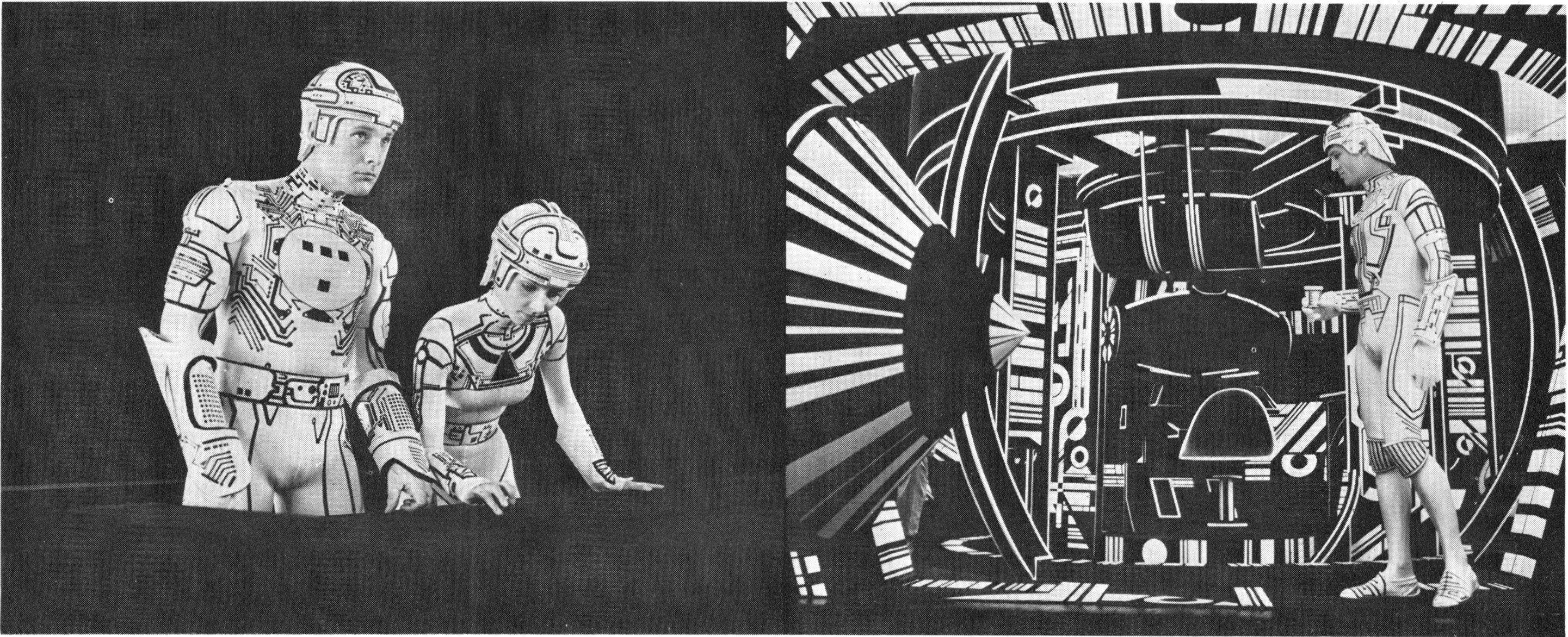 Logan experienced some difficulty in getting a 65mm camera properly tuned so that it didn’t chew up film, and it was hard to find an operator who had shot with a rackover viewfinder. The biggest problem however was getting enough light to shoot at the f-stop he needed to use. Because every frame of the black and white live action footage was going to be blown up onto Kodaliths and composited with other elements it had to be absolutely sharp. Not only was it necessary to stop down to get the maximum depth of field — a problem which was aggravated by the large negative format — but also it was necessary to cut down the shutter angle in order to prevent blurring of edges during movement.