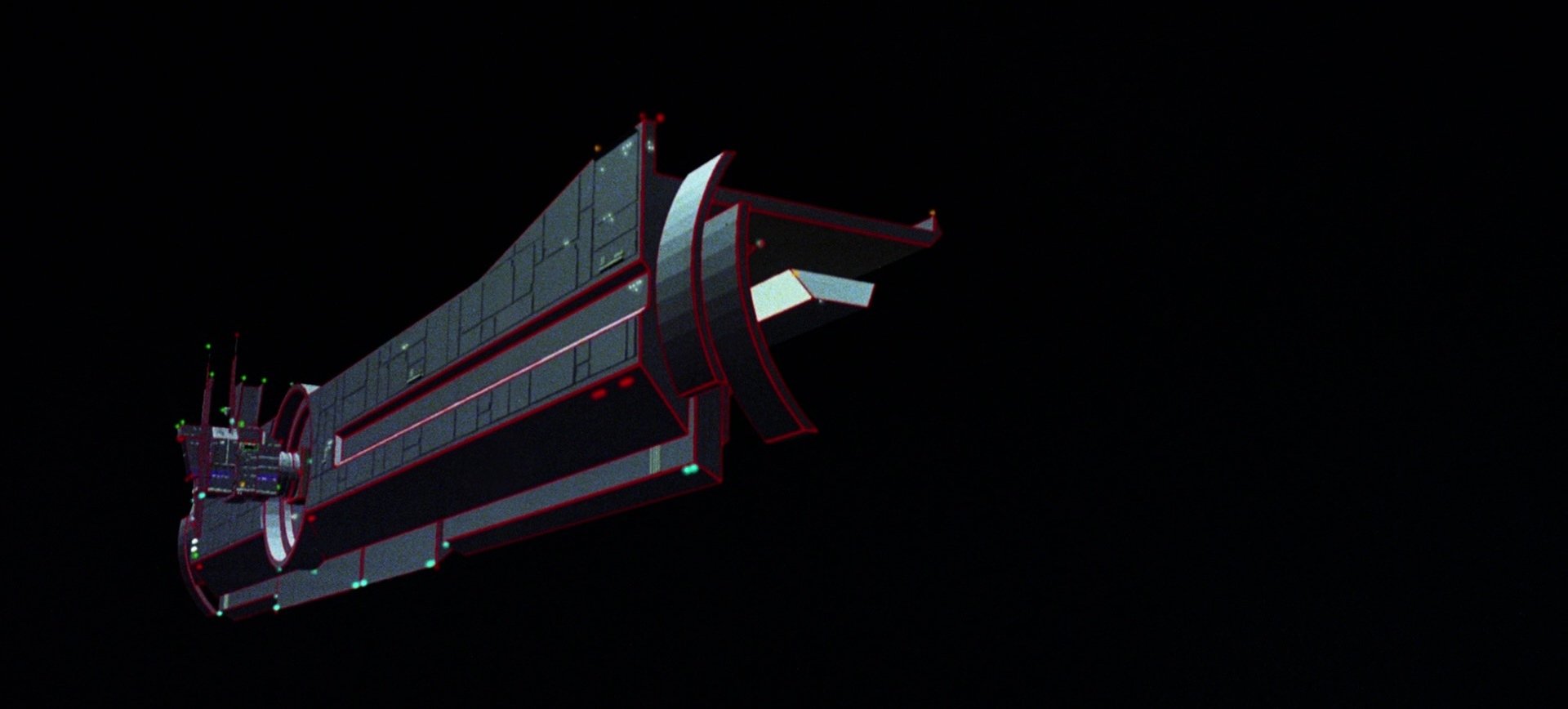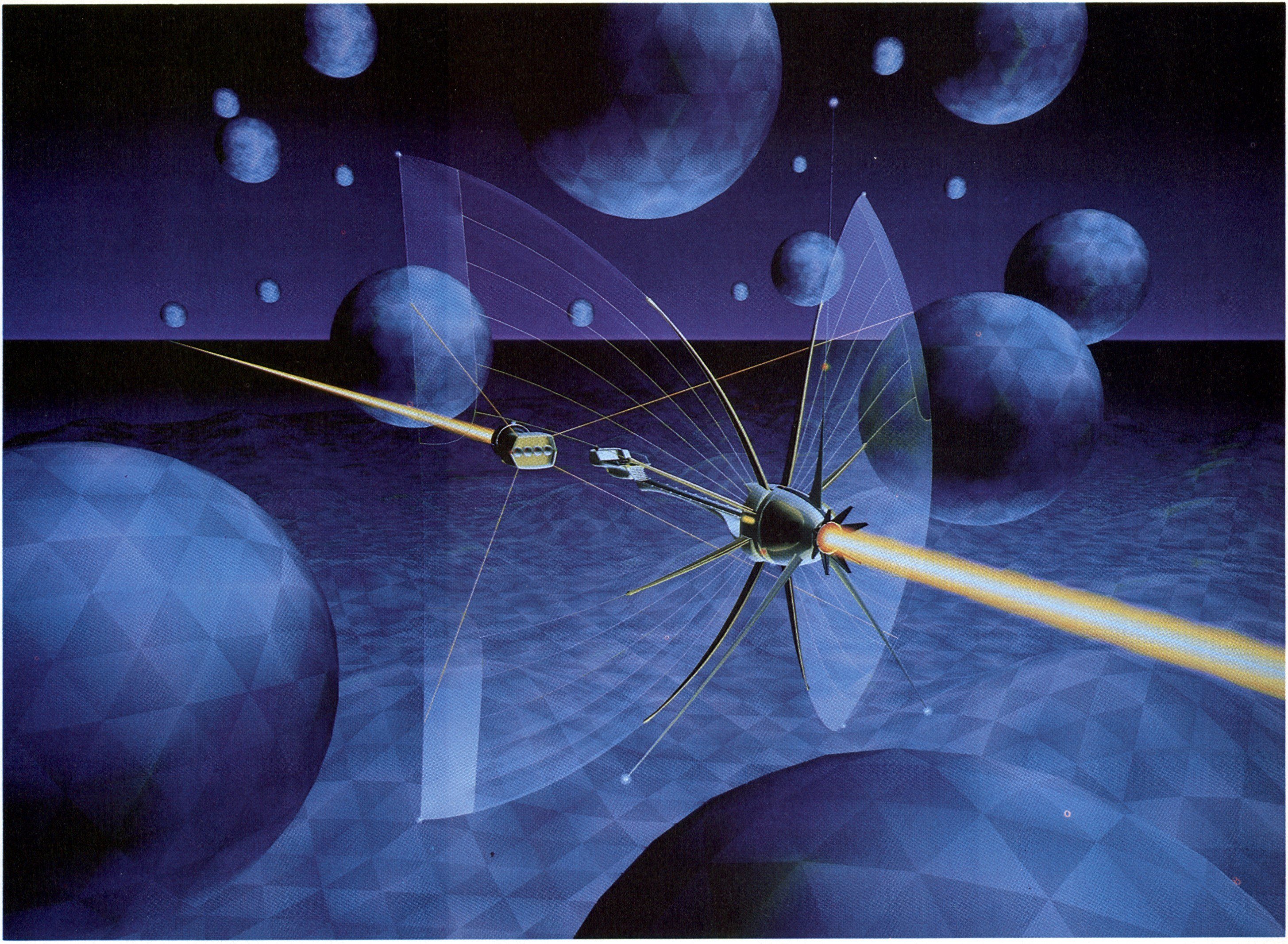 For the solar sailer Mead used a Spanish galleon as the starting point because he felt the description in the script had a kind of baroque sound to it. “The solar sailer started off as a Spanish galleon to capture the romantic aspects of a ship, so you have the poop deck on the one hand and the forecastle on the other with a sort of loop between. I gradually changed that into an organic fuselage and then took the sail on a shaft coming off the side with something like a tension plate with wires and riggings going back to a wobble so that you could manipulate the sail.