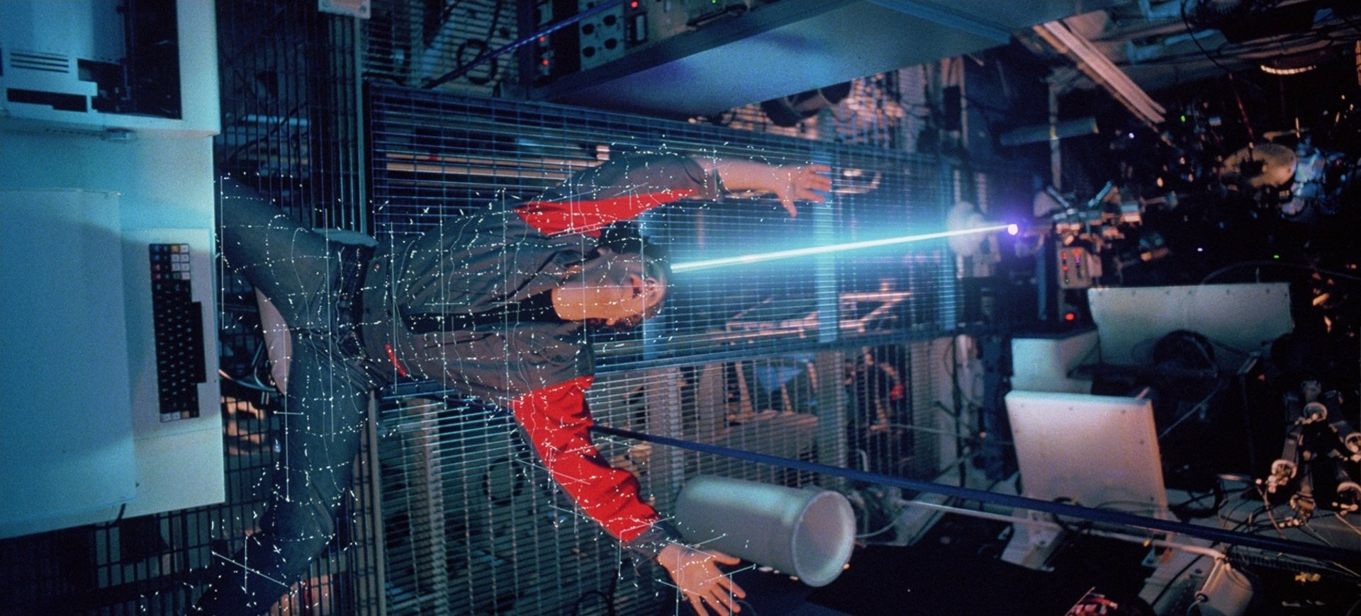 The actors wore white costumes with black lines on them that needed to reproduce cleanly in order to add the glowing vector lines. With rapid movement the black lines would tend to smear and register as gray instead of black, and if the gray were above a certain density on the negative, it would not be picked up in the Kodalith. The net result would be that the vector line would simply disappear during the motion.
