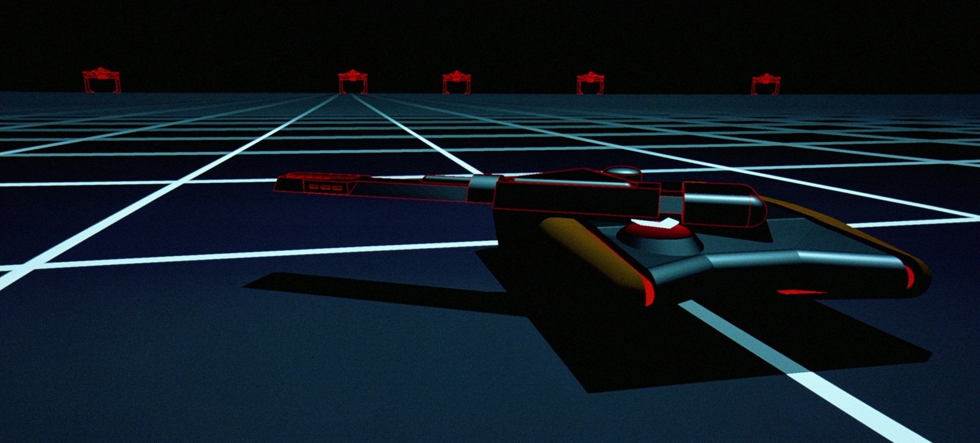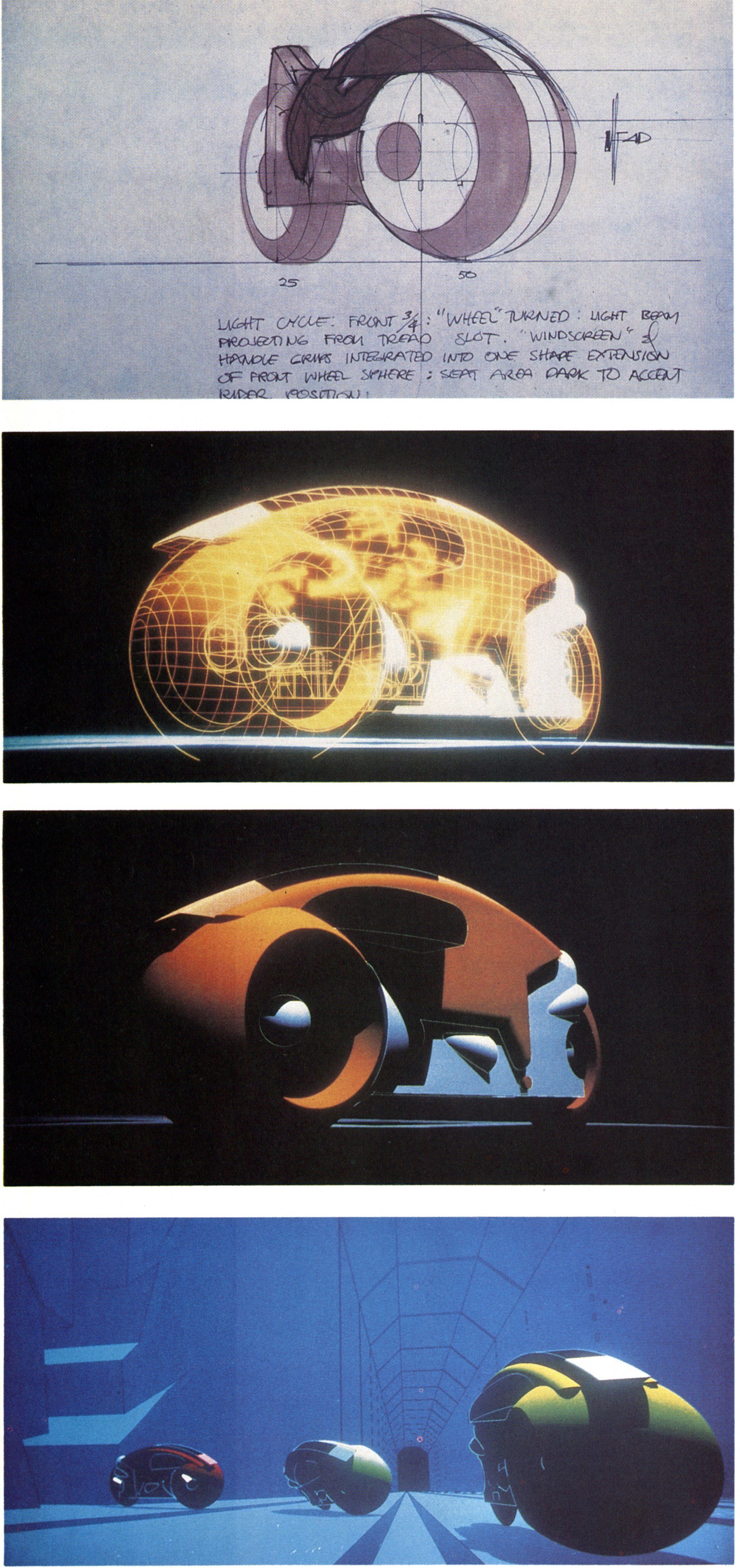 Although Mead was aware of the way in which the computer was used to construct its models of the objects, he did not really let that influence his designs too much. He was, in fact, surprised by the way some of his designs meshed with the computer programs. “The tank, which is a very complex object, was relatively cheap to produce in the computer memory whereas the light cycle, which is relatively simple — a round sphere with a blade construction — was very, very difficult and required a lot of compromises to make it look like it does in the finished footage.”