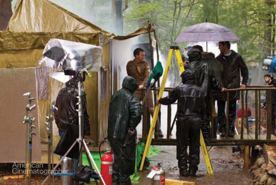 For the portions of the storm that took place at the exteriors of the scout camp, we used a couple of Lightning Strikes units, giant Ritter fans, rain bars and rain towers. We placed two 18Ks on towers to backlight the rain and often incorporated them into the shot. We lit the subsequent scene inside the church with traditional movie lighting — tungsten lights, Kino Flos, and two balloon lights floated overhead to provide a very soft base ambience. Our gaffer, Frans Wetterings, was a wonderful collaborator on all of these ambitious lighting setups. To create the storm effects outside the church, we used our Lightning Strikes units gelled with ½ CTO to make them less blue. The shots of the kids climbing the church steeple were done on a stage with a black background, with tungsten units backlighting the water and the rain. We used real rain for those shots, but for the church windows, Wes wanted us to create the rain effect with lighting rather than traditional rain bars. We experimented with some theatrical-lighting units and found a system called Gam SX4 that could project different rotating patterns placed in front of Lekos; we just defocused them a bit to create the feeling of rain on the windowpanes. Sometimes we even projected those patterns onto the interior so it looked as if rain was coming from the windows.