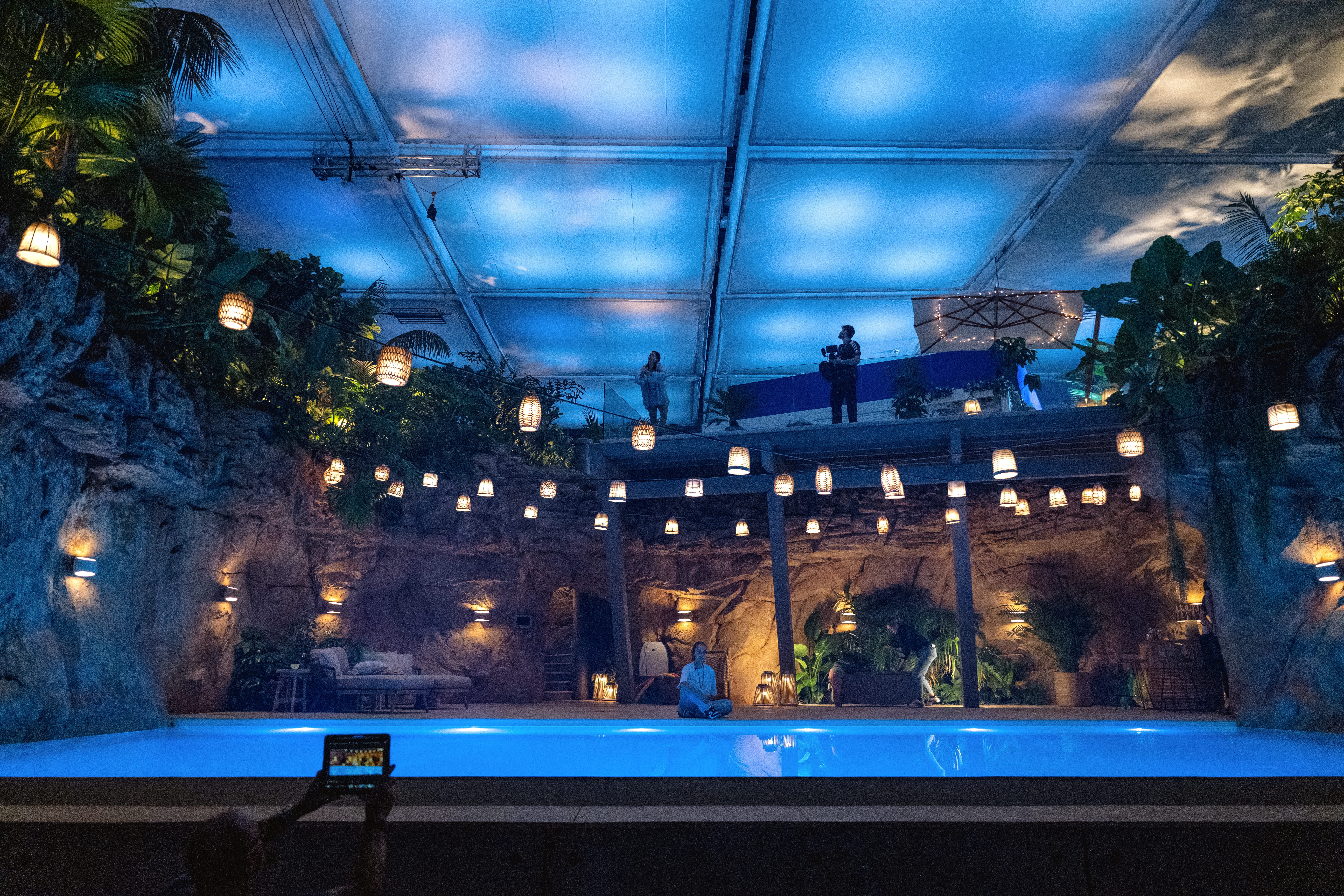Most of the film was shot on the aforementioned interior/exterior set, which was built on a stage in Sky Elstree studios in London. This large, three-tiered set was elevated to allow for the depth of the swimming pool, which meant that the set wouldn’t leave a huge amount of space between its top floor and our reds. I needed a lighting solution that I could use across both the stage work and the exterior location.