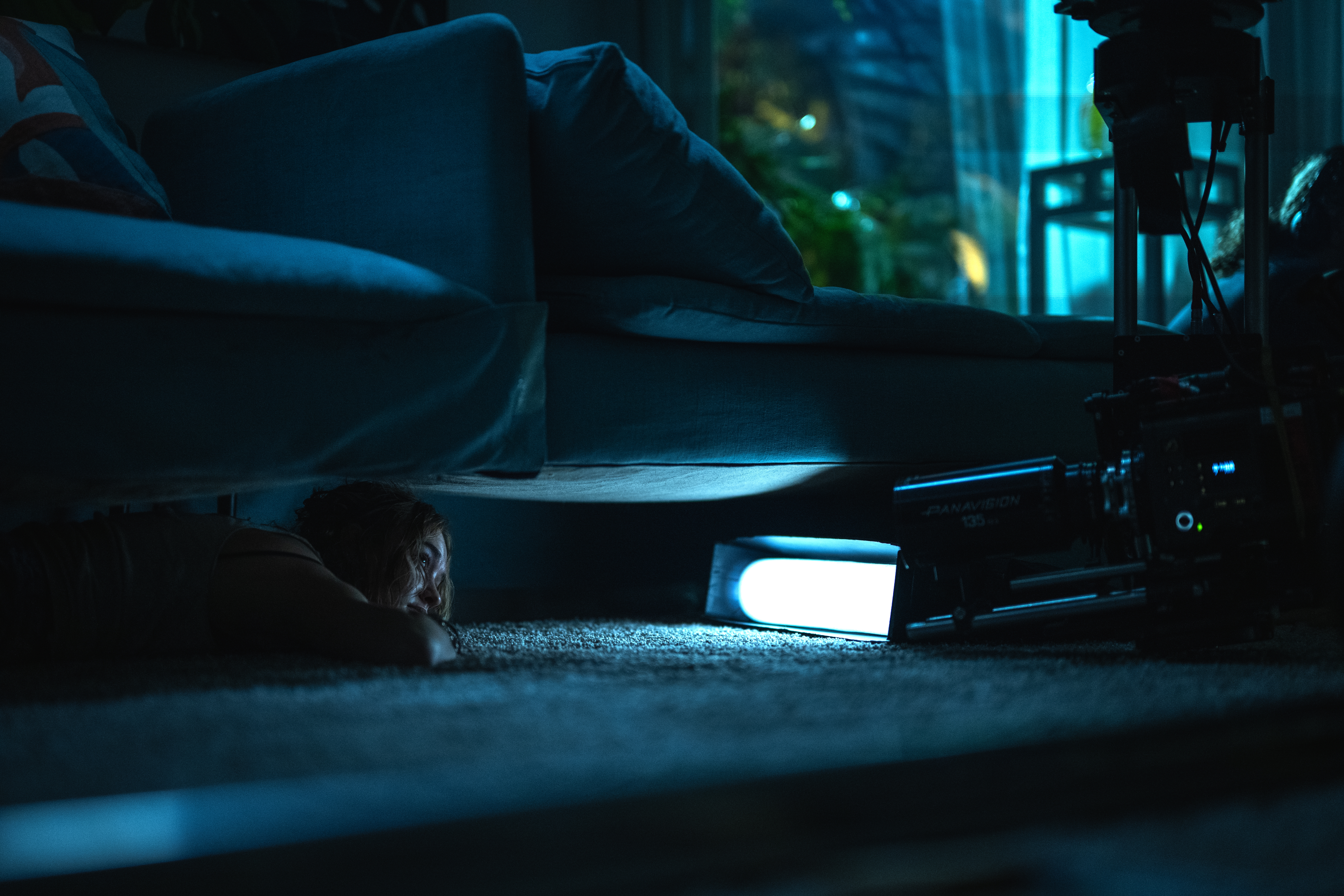For the moment in which the characters hide in the closet and pull the door closed, I asked the art department to make a version of the door that had a larger gap at the bottom, out of shot, so I could cheat light in from outside by skipping a Domino off of bleached muslin tapped to the floor. As our actors pushed deeper into the closet, I could extend that light source with several noodles placed directly on the floor.