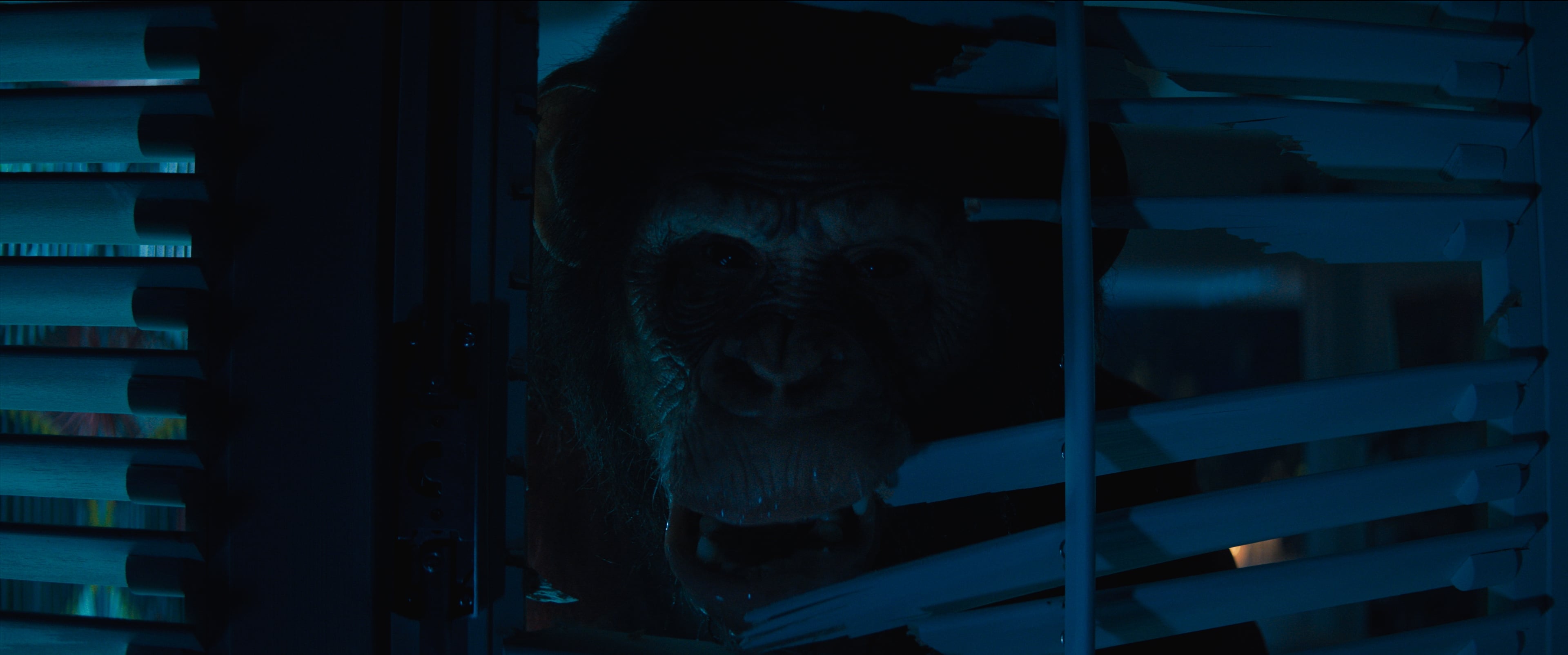 ...and cut back to slow, creeping shots as they move through the living room and ultimately discover that they need to hide in the back of the closet, as the chimpanzee, Ben, tries to break in, with the camera getting closer and closer throughout the entire sequence.