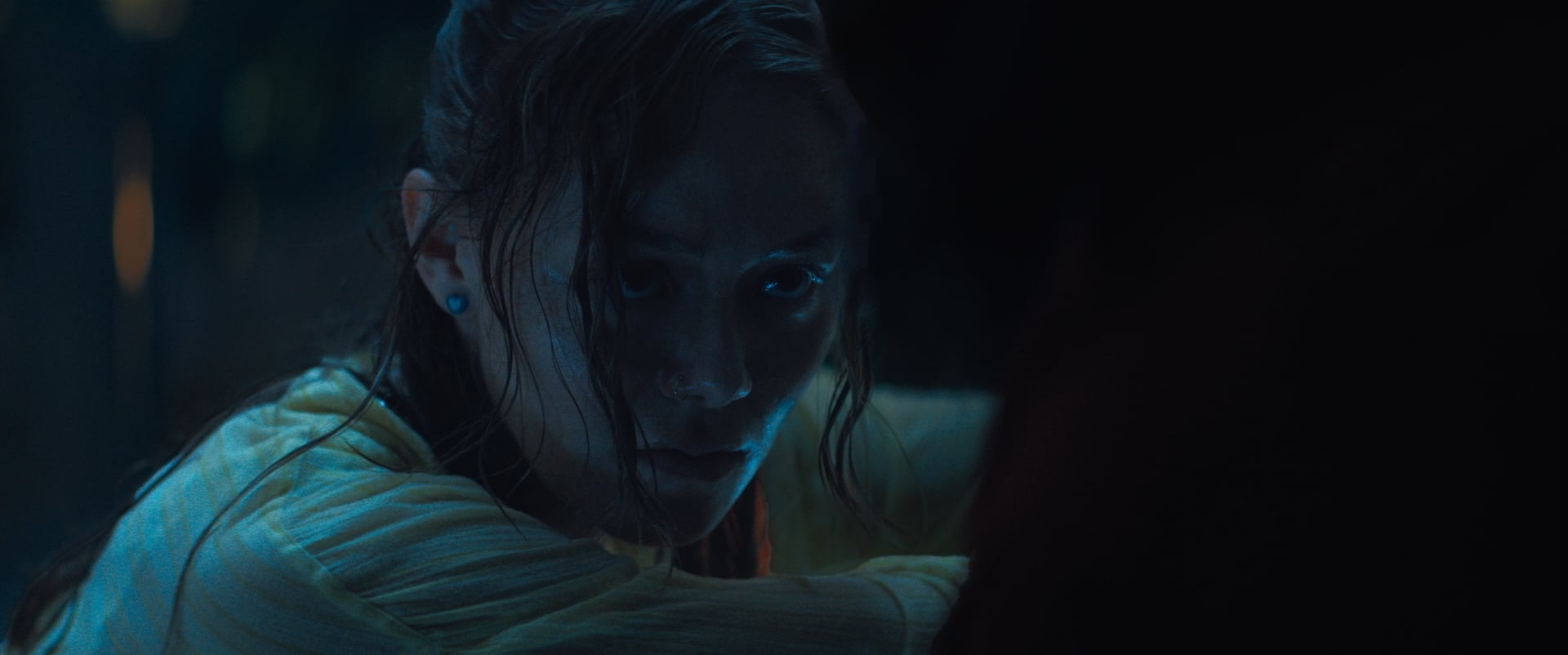 For our more mobile Steadicam shots, we would often add a Rosco DMG Dash LED with a silicon diffuser dome on the end of a boom pole as a mobile eye light. I've found that adding an eye light is incredibly useful, especially on visually darker material. It helps give the viewer something to focus on, and it gives your eye a contrast reference, which then allows you to be even darker with the environment lighting.