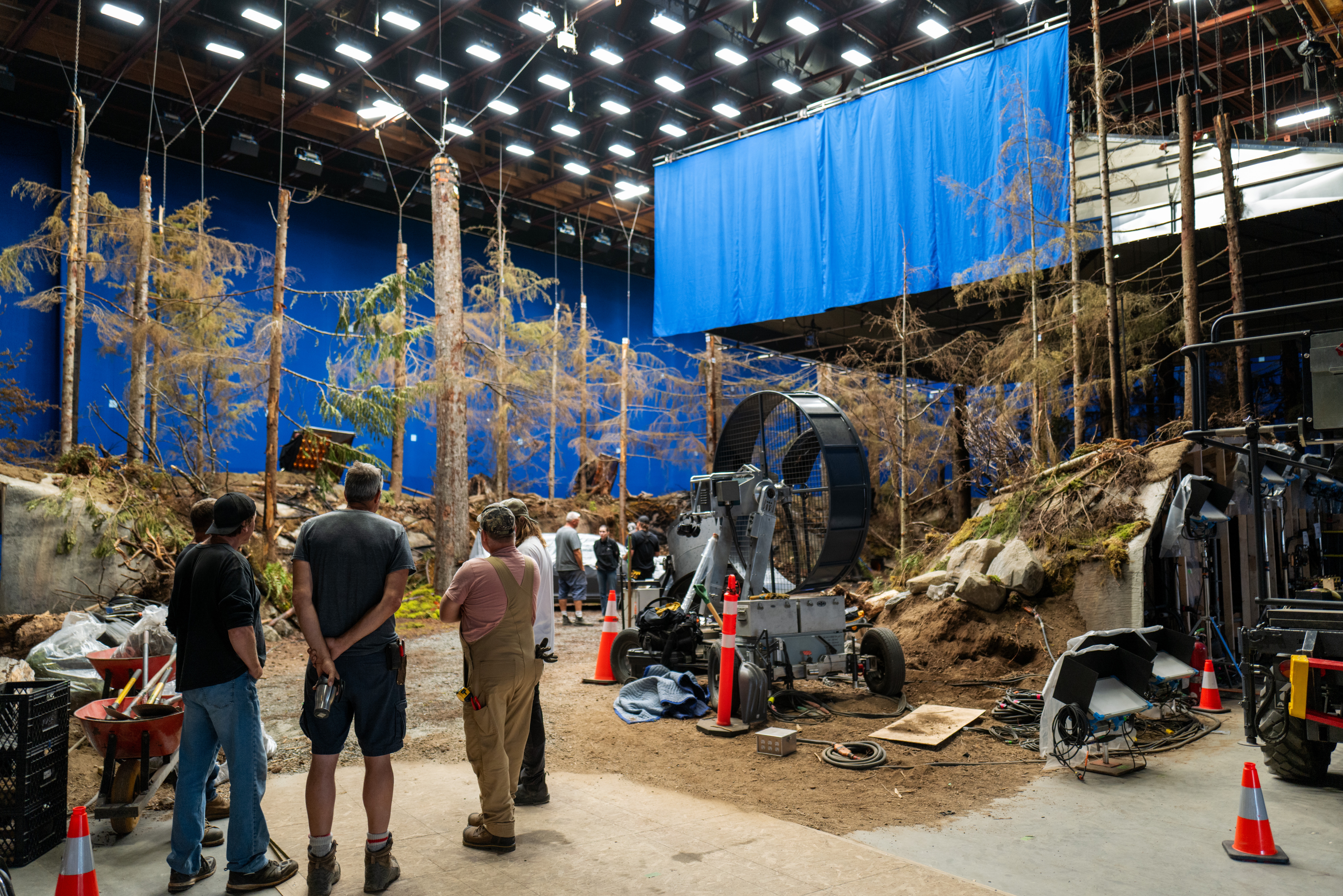 We opted for big sources like Mole-Richardson Moleenos and overhead "coop" lights, Maxi Brutes, and 20Ks, which were usually on moveable scissor lifts. For closer work, we also made soft boxes out of Arri SkyPanel S360-Cs, all of which were moveable. For each fixture, board operator Ian Gledhill found the right flicker balance to emulate fire light. We also had rows of SkyPanel S60-Cs to light a blue backdrop for VFX all around the stage. We used Aputure 2400Ds to bounce in sections of the ceiling where we could not rig lights. Otherwise, we had rows of Arri SkyPanels overhead to emulate sky ambience.