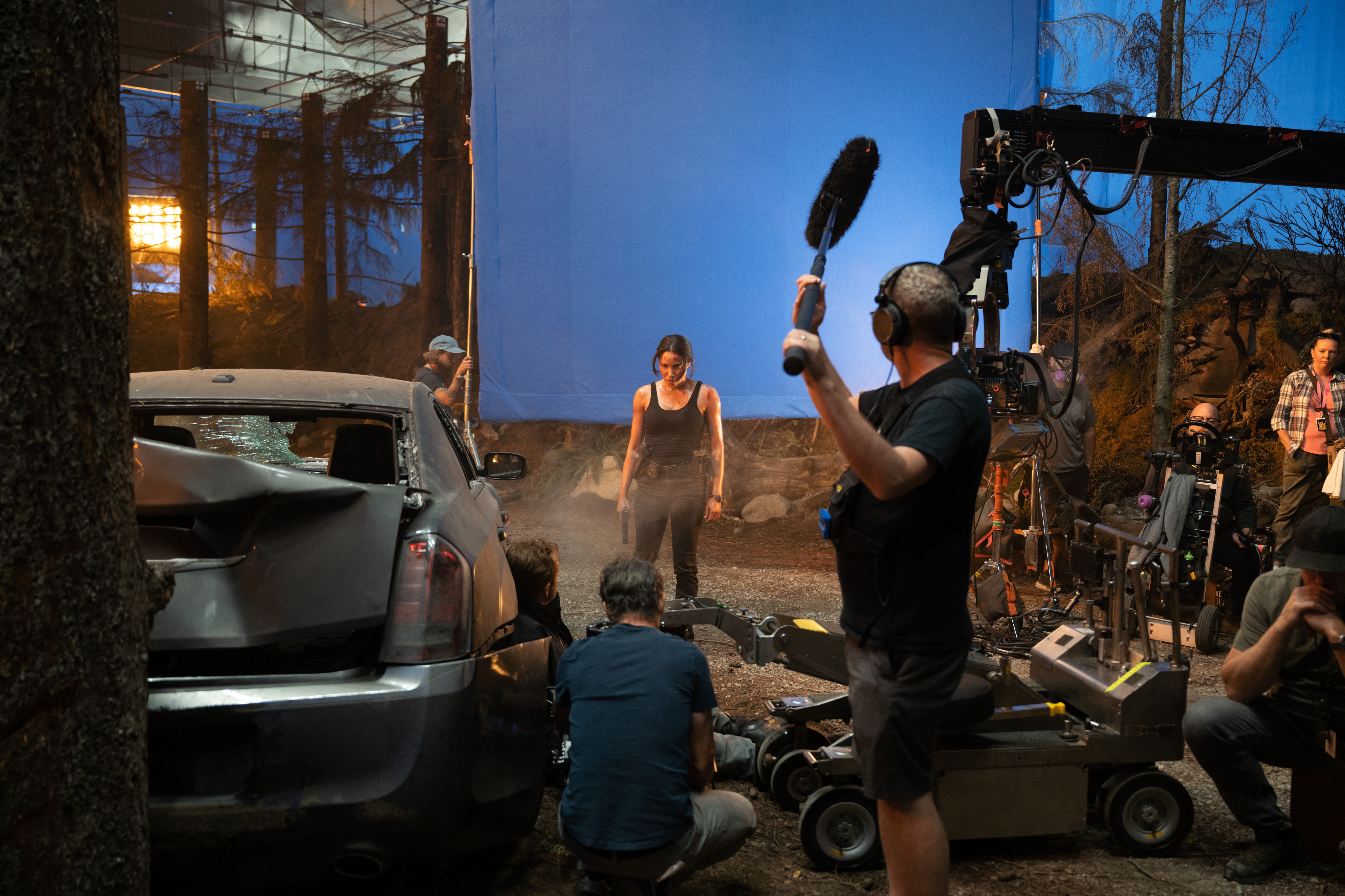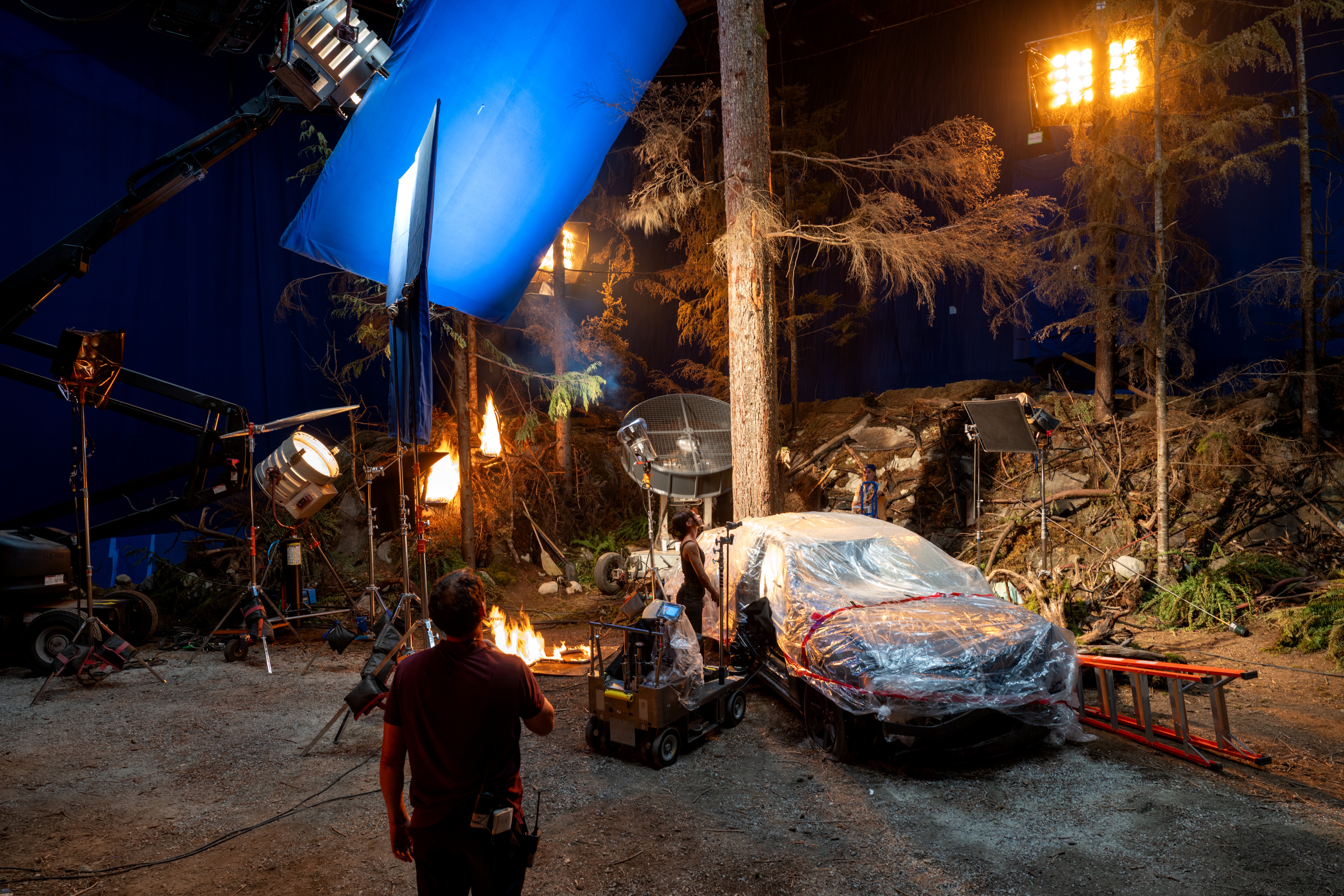 Still, I was concerned that shooting a forest fire that takes place during the day on stage might feel unrealistic. In order to for the scene to look as if it's taking place in natural world, we needed to incorporate wind effects and ambient light, and the convey the depth of the forest. With these aims in mind, both our special-effects and production-design departments showed us a fire test, in which the forest's trees and ground looked realistic — and also met our on-set safety and health requirements — and it was this test that got me on board to shoot on stage.