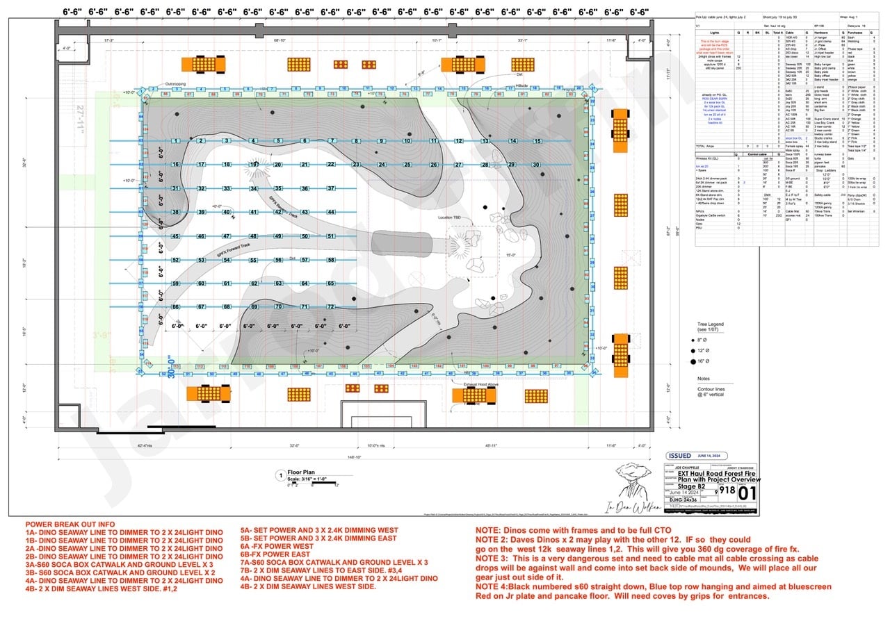 Gaffer David Tickel, rigging gaffer Jarrod Tiffin and I began working on our lighting plan about three months before the shoot. (See our lighting plan for the scene in the diagram below.) David and Jarrod's comprehension and suggestions made a huge impact on our lighting-design choices. The base of the lighting came by real fire — all controlled by gas and flame bar — and of course, we also had our own lighting.