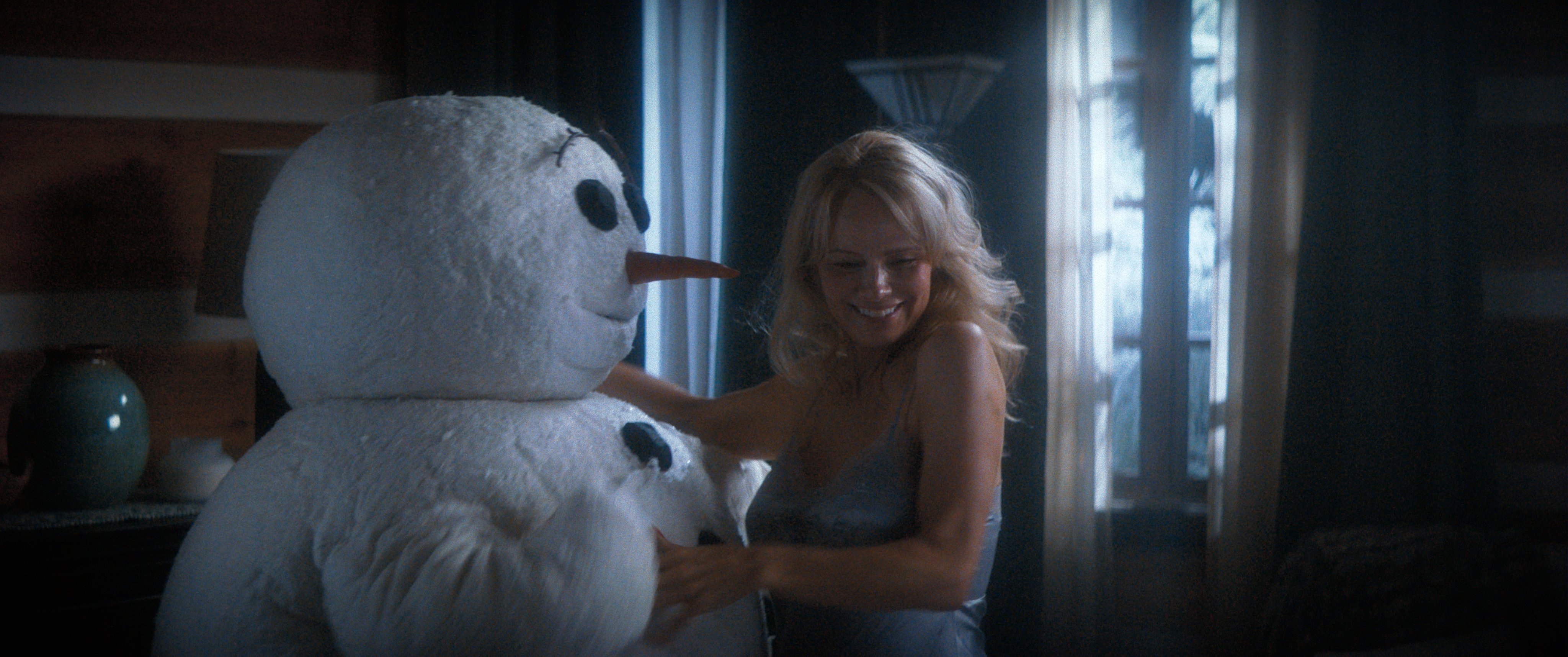 Still, nothing was crazier or sillier than our snowman sequence. The scene is basically a cabin-set romantic montage between Frank, Beth Davenport (Pamela Anderson) and a six-foot snowman. The team at the Jim Henson Company built us an animatronic snowman puppet, which was fun all on its own: One puppeteer performed practically, inside of the suit, while another controlled features like the face, mouth and eyebrows. We wanted the initial moments of the sequence to feel almost like a 1980s chewing-gum commercial or a cheesy romantic B movie. It’s very bloomy, and we used a heavy Tiffen 1/2 Pro-Mist filter for a dreamy look. Despite this being shot mid-summer in Atlanta, our effects people did a great job dressing our exterior cabin set to give it a snowy and wintry look.