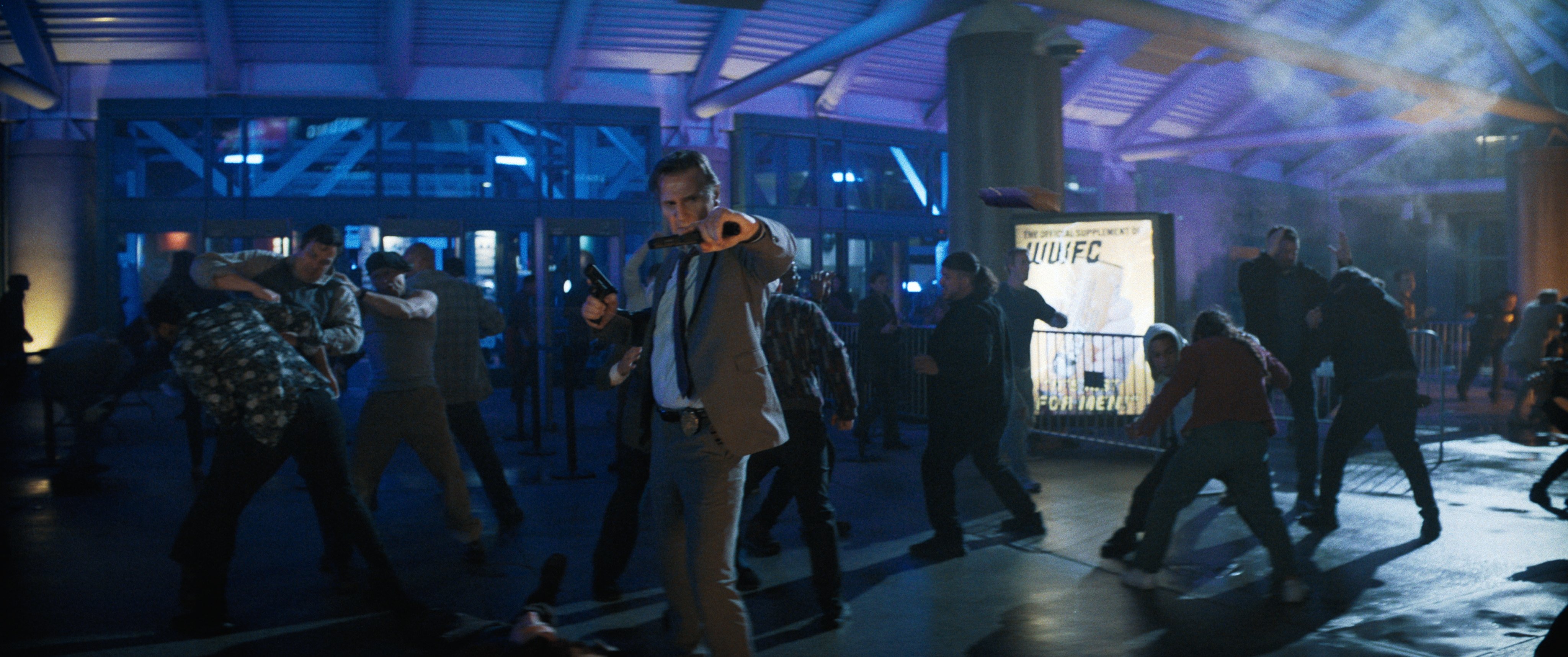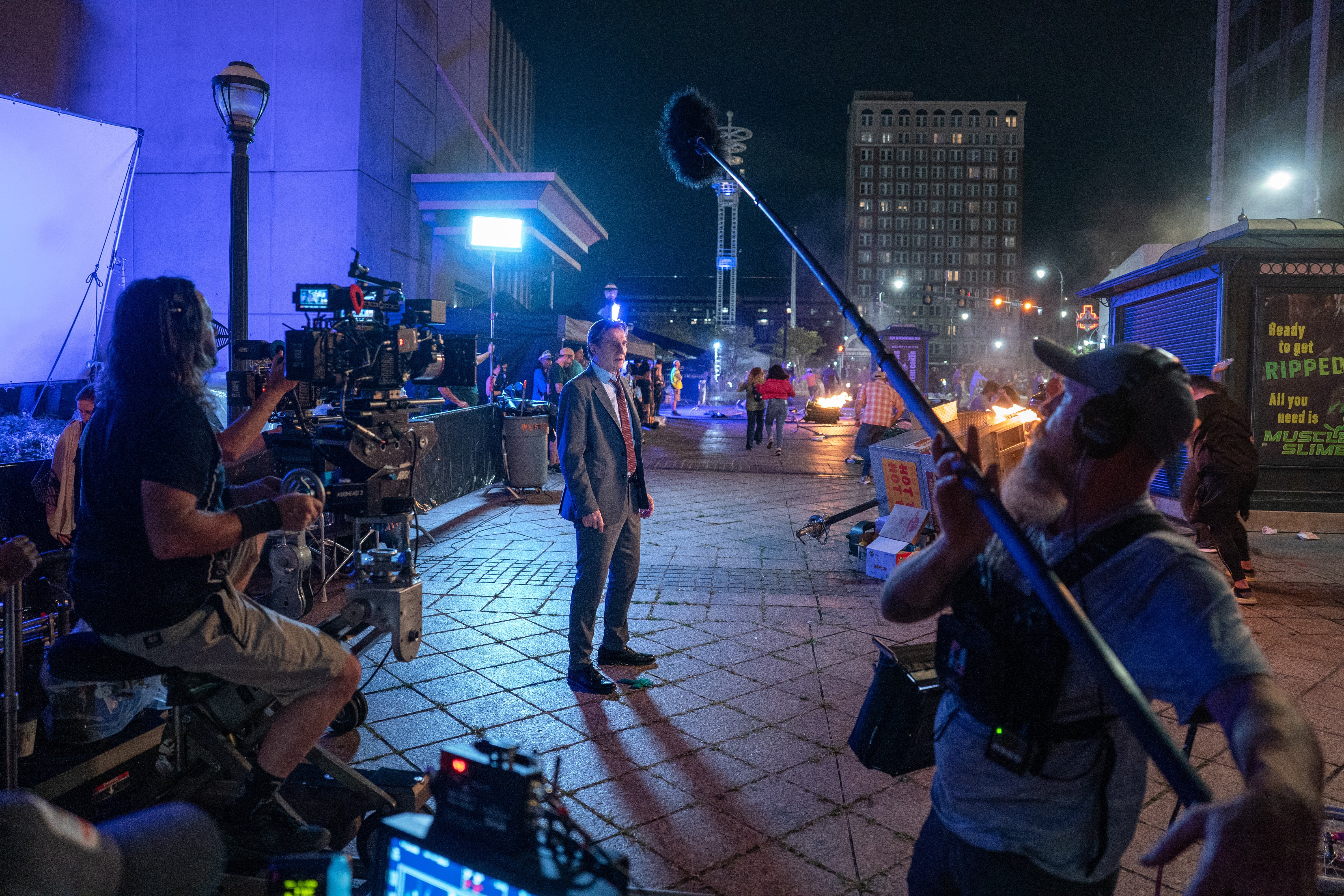 For the Convention Center sequence, we relied on Panavision’s G Series lenses, and we had to light the scene for almost 360 degrees. The exterior of our location provided an ideal spot to place an 18K high up on an adjacent piece of architecture upstage for most of our shots. That broad, hard source worked for the majority of the scene. For certain reverse shots, If I decided I wanted to cheat more of an edge, as opposed to the scene being front lit, we had another lift positioned much farther out, in the opposite direction, to emulate that same light. We also rolled around five Arri SkyPanel S360-Cs with large Chimera bags, which gave us a mobile, big soft source. I would fill with fire sources wherever I could get them out of frame, and we added architectural lights behind pillars and within some of the architecture of the Convention Center itself. We aimed to imbue the scene with a blue-and-purple tone that I had established at our original arena in Atlanta, so I pushed in those colors from different nooks and crannies wherever I could get them in.