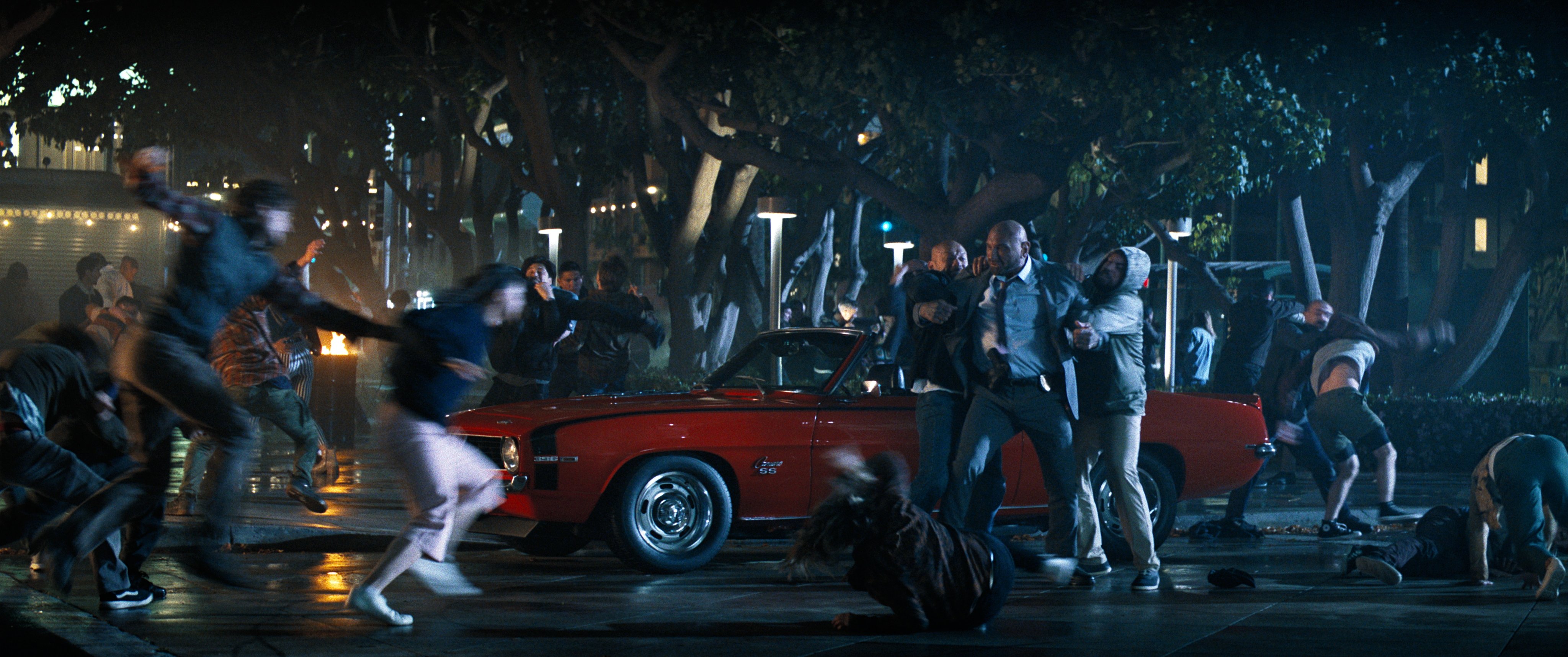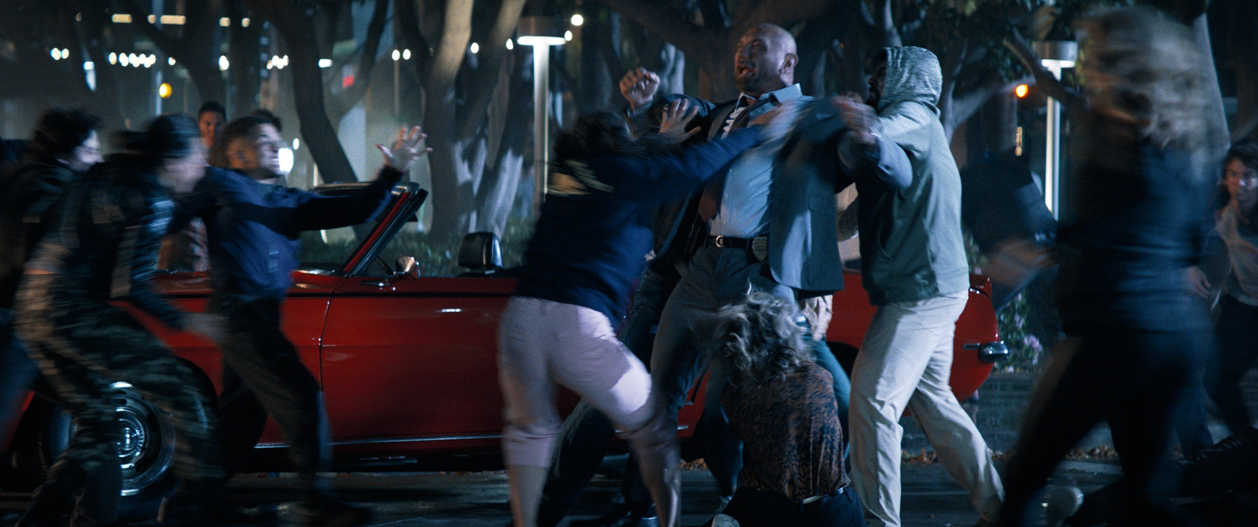 For one sequence toward the end of the film, we deviated from our vintage approach and leaned into a more modern John Wick-like style of action. The scene takes place outside of an arena, with Frank using his gun clips to basically ricochet off of bystanders' faces. The scene called for a lot of crazy slow-mo and dynamic camera moves. We shot this sequence in front of the Convention Center in downtown L.A. as part of additional photography months after we’d wrapped, working closely with our L.A.-unit stunt coordinator, Wayne Dalglish, who had previously designed amazing fight choreography and stunt sequences for James Gunn.