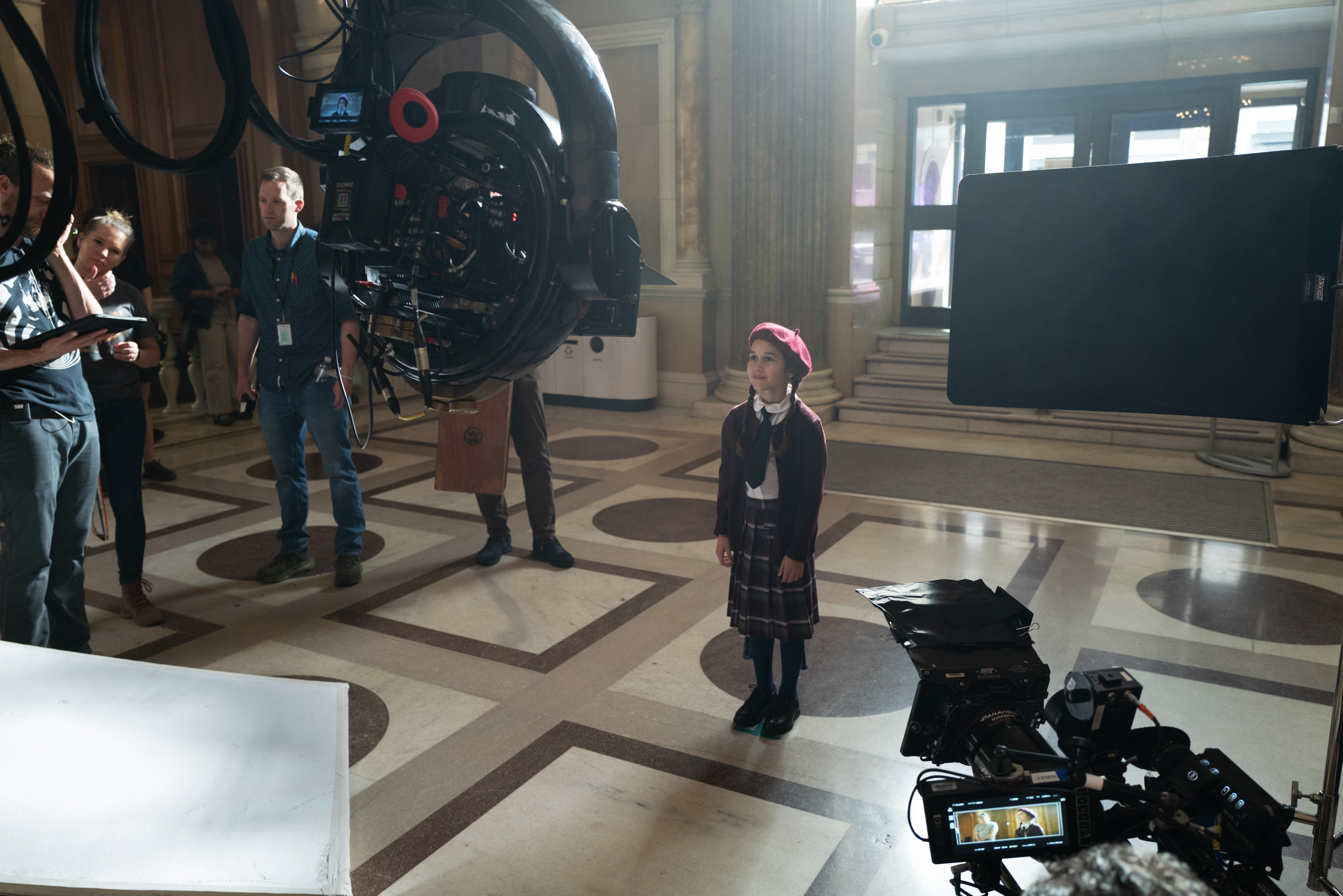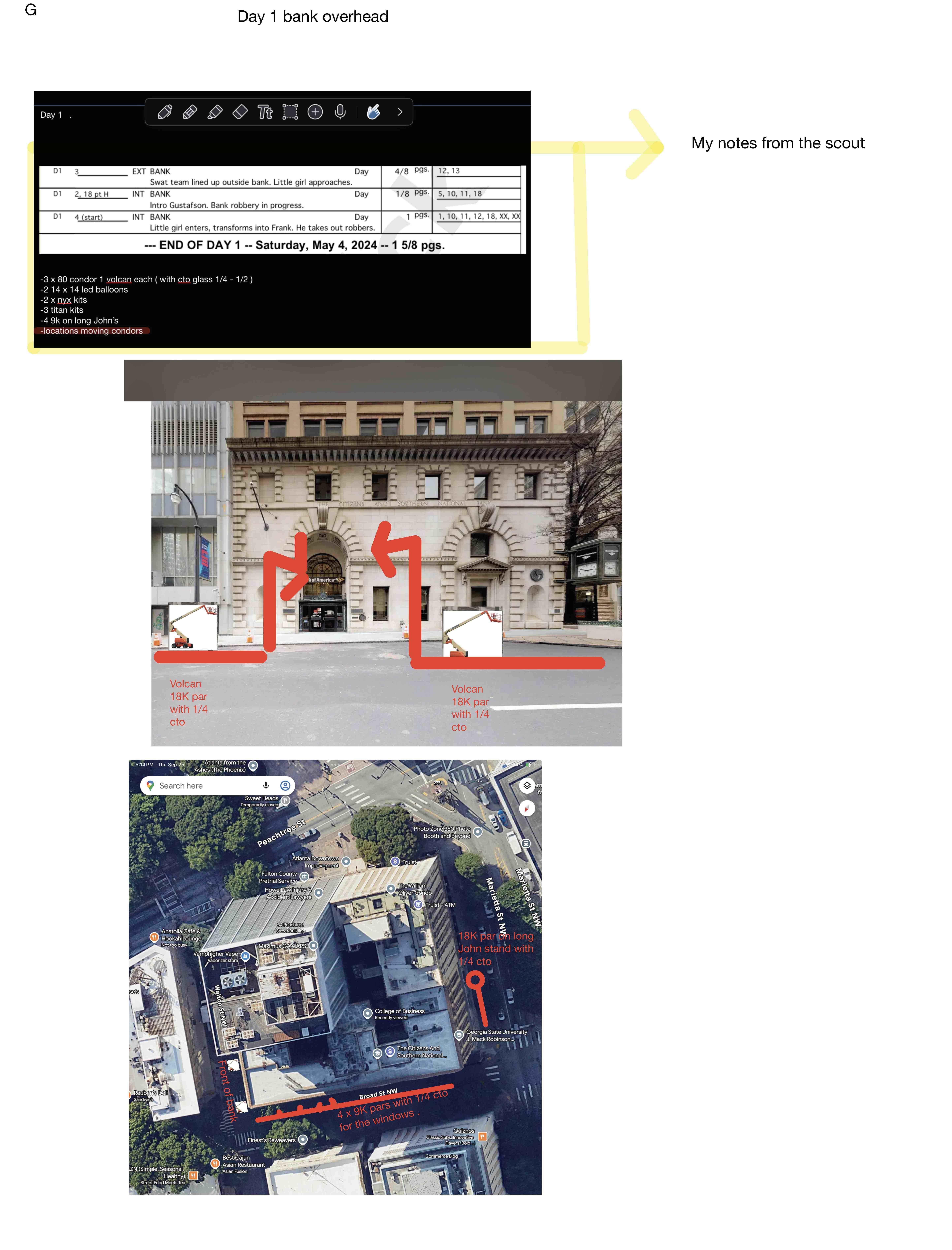 The one thing that I didn’t love about our location, which was a real working Bank of America in Downtown Atlanta, was that I wanted multiple shafts of light to enter the space, but the building didn’t have a lot of windows. (See my initial notes from the scout below.) There were only two main windows, with one on each end of the bank. For the primary window above the entrance, we had two Condors — each with an 18K Volcan. We created a crisscrossing of light beams, with one beam from the right side of the window and another from the left; this was a trick we relied upon to spread the beam in the smoke and make it look wider than what it would otherwise look like naturally, if only sunlight was shining through.