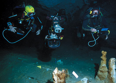 | Underwater director of photography Wes Skiles (center) and underwater gaffers Chuck Stevens (left) and Tom Morris (right) prepare to shoot at 500' in Hidden Worlds Cave, Tak Be Ha, Yucatán, Mexico. | ||