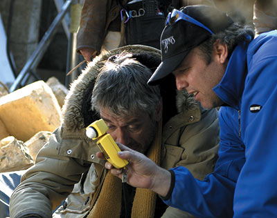 Emery checks the light on actor Marcel Iures.