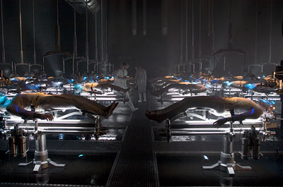| Suspended agnate bodies are implanted with long-term memories in the Foundation Room. In the set’s ceiling, 80 Source Four Lekos with 5-degree barrels were aimed straight down at the clones. | ||