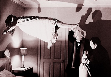 Fathers Merrin (Max von Sydow) and Karras (Jason Miller) compel the forces of evil to release Regan (Linda Blair). The levitation was done practically, as were almost all the film’s effects. To hide the fine wires suspending the actress, Roizman carefully painted them with a pattern of alternating shades.