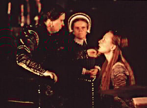 The uncrowned Elizabeth undergoes interrogation by her crazed half-sister, Queen Mary Tudor (Kathy Burke). Besides shooting through fabrics, Adefarasin also softened the sheen emanating from fixtures with such clothing materials as wool, silk, lingerie and hand-made lace. "Very simply, what it does is to make the shot look not lit it's like breaking up a steady stream of light into different particles, so that light and textures cross people's faces. I propped up or draped the fabric on Century stands and flags. That cuts the light from the walls so that the eye [of the viewer] goes to the character rather than a detail in the wall. I always use silks when I want to make people especially women look softer. It's a more practical material because tracing paper rattles and crackles."