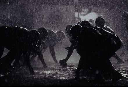 Offensive and defensive linemen square off in a driving rainstorm. In their attempt to infuse the film with overtones of trench warfare, director Oliver Stone and cameramn Salvatore Totino went so far as to use techniques employed by Steven Spielberg and Janusz Kaminski, ASC on the World War II drama Saving Private Ryan.