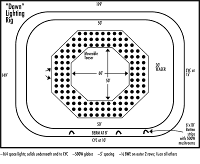 | Deakins stands beneath an overhead grid of space lights in Stage 12 at Universal, where he and the crew created an extended twilight-to-dawn “exterior” sequence. Lighting diagrams for the scene reveal the cinematographer’s approach (Image 2 of 3). | ||
