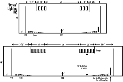 | Deakins stands beneath an overhead grid of space lights in Stage 12 at Universal, where he and the crew created an extended twilight-to-dawn “exterior” sequence. Lighting diagrams for the scene reveal the cinematographer’s approach (Image 3 of 3). | ||