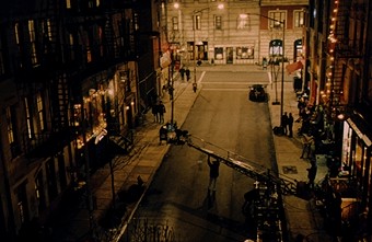 An overhead view of the elaborate Manhattan street sets constructed at Pinewood Studios by the picture’s production design team, led by Les Tomkins and Roy Walker. Four blocks of facades were dressed with authentic items shipped in from New York City.