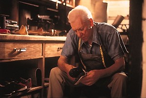 Track coach Bill Bowerman (Donald Sutherland) works on a custom racing shoe.