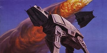 A ponderous Snow Walker on the Ice Planet Hoth is attacked by a fighter craft. This is not a matte painting, but rather one of the highly detailed production design storyboard renderings painted by Conceptual Artist Ralph McQuarrie, who also "doubled in brass" by painting about half of the matte paintings used in The Empire Strikes Back. This proved to be a great aid to Harrison Ellenshow, who came onto the project after principal photography was completed.
