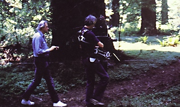 Dennis Muren follows Garret Brown and operates the Heden remote control for the VistaVision camera’s special roll cage to produce the effect of a POV through a banked turn. Long experience with motion control cameras and a large calibrated scale on the camera helped him ease in and out of a slow roll of the camera itself which is designed to look realistic at 24 fps. (30 times faster than the actual camera speed of 3/4 fps).