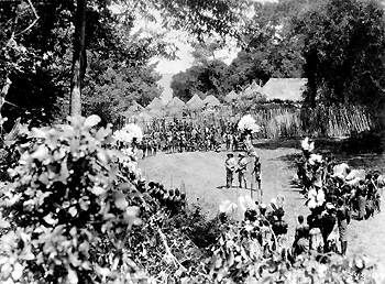 Duncan Renaldo, Harry Carey and Mutia Omoolu are seen at a disadvantage in a remote up-river village. Those white dots atop some of the poles are human skulls.