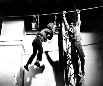 In this shot, the athletic Lazenby makes his way hand-over-hand along the suspension cable of a gondola car. Camera operator Alec Mills hangs on a "flying ballet"-style rig for an excellent close-up with a handheld Arriflex, the battery pack suspended behind him. The action is set 10,000' above sea level at the top of Mount Schilthorn in the Swiss Alps, the lair of Bond's felinophilic SPECTRE nemesis, Ernst Stavro Blofeld (played by Telly Savalas). During the scene in question, Bond must successfully traverse the cable or be crushed by a set of massive gears.