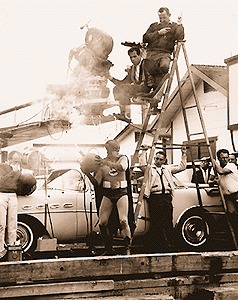 This photo was taken during the tight 26-day production of the Batman feature, directed by Leslie Martinson, as the not-so-Dark Knight (West) races comically about a pier trying to dispose of a large bomb. Schwartz is observing the action from the top of the ladder, plotting a shot for his blimped Arriflex camera while his cohorts seem less than excited about the superhero's dilemma. In the film, the Dynamic Duo battle a cadre of supervillains: The Penguin (Burgess Meredith), The Joker (Cesar Romero), Mr. Freeze (George Sanders), The Riddler (Frank Gorshin) and Catwoman (Lee Meriwether).